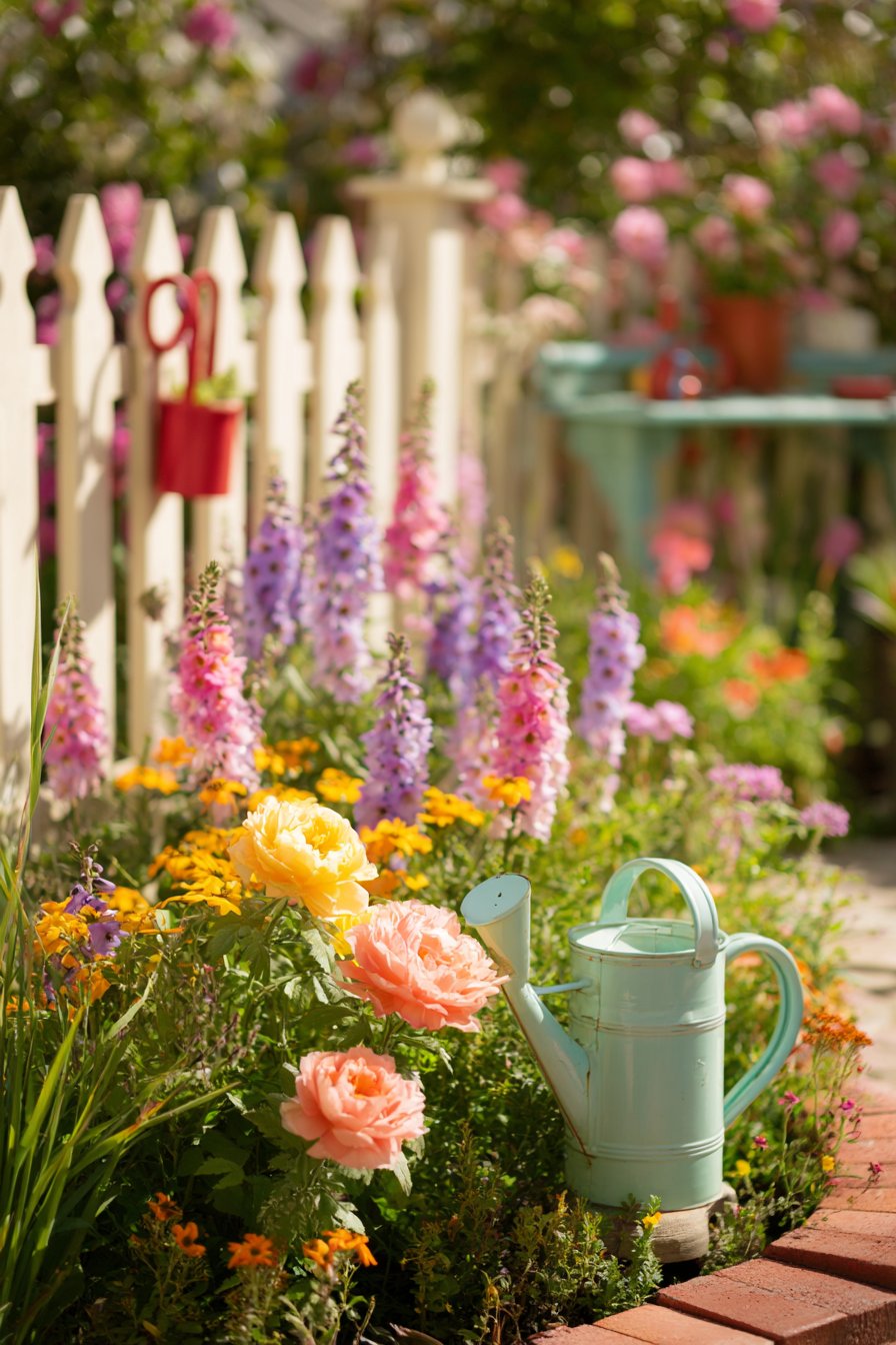 A white picket fence painted in soft cream provides classic backdrop for colorful plantings. Terra cotta edging in weathered red-orange defines curved garden beds. The traditional materials ground the exuberant color scheme.