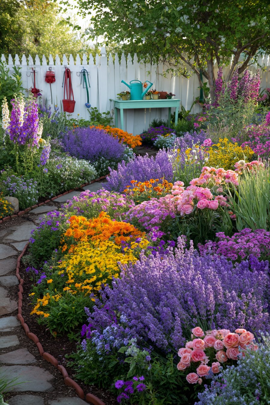 Abundant blooms create a rainbow spectrum throughout this cottage-style flower garden. Lavender delphiniums, coral peonies, sunny yellow coreopsis, hot pink roses, and purple salvia grow in naturalistic arrangements. The varied heights create visual rhythm.