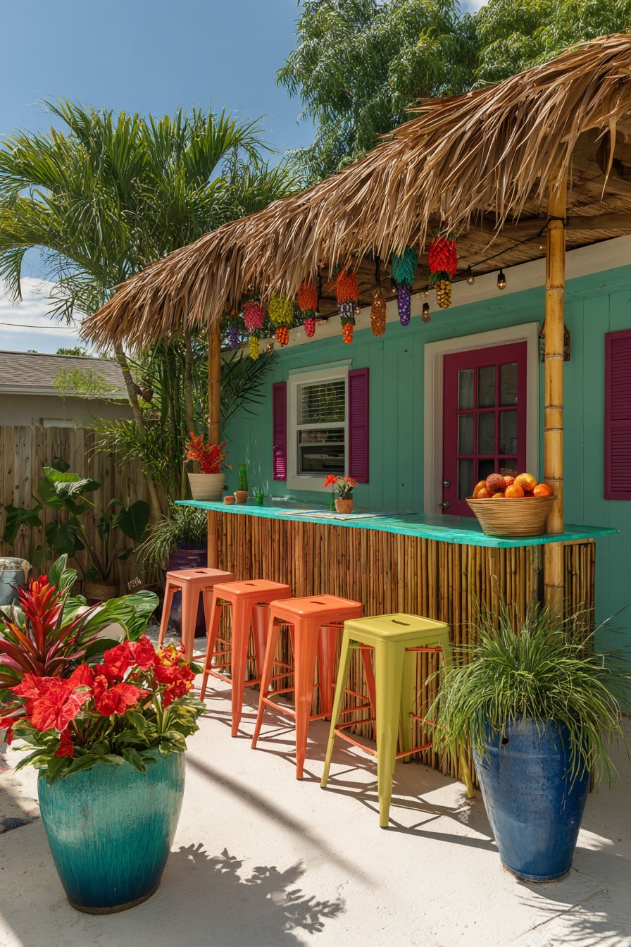 A tiki bar structure features a thatched palm roof and bamboo posts wrapped in bright colored rope. Lime, orange, and magenta rope creates tropical vibrancy. Bar stools in coral, tangerine, and flamingo pink surround the counter.