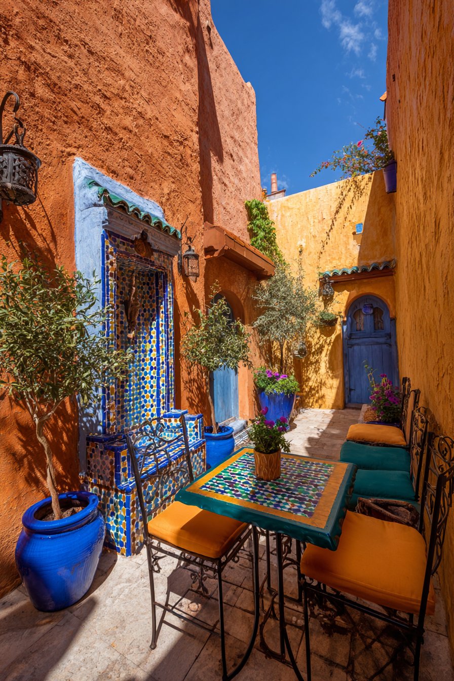 The courtyard’s intimate scale makes bold colors feel cozy rather than overwhelming. Architectural photography captures this balance beautifully. Mediterranean design principles inform every color and material choice.