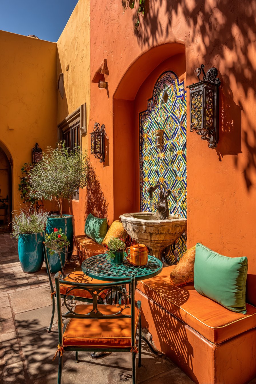 Stucco walls painted in warm terracotta orange and sunny ochre yellow define this intimate courtyard. The Mediterranean color palette creates inviting warmth. Cobalt blue ceramic pots in various sizes hold lavender, rosemary, and citrus trees.