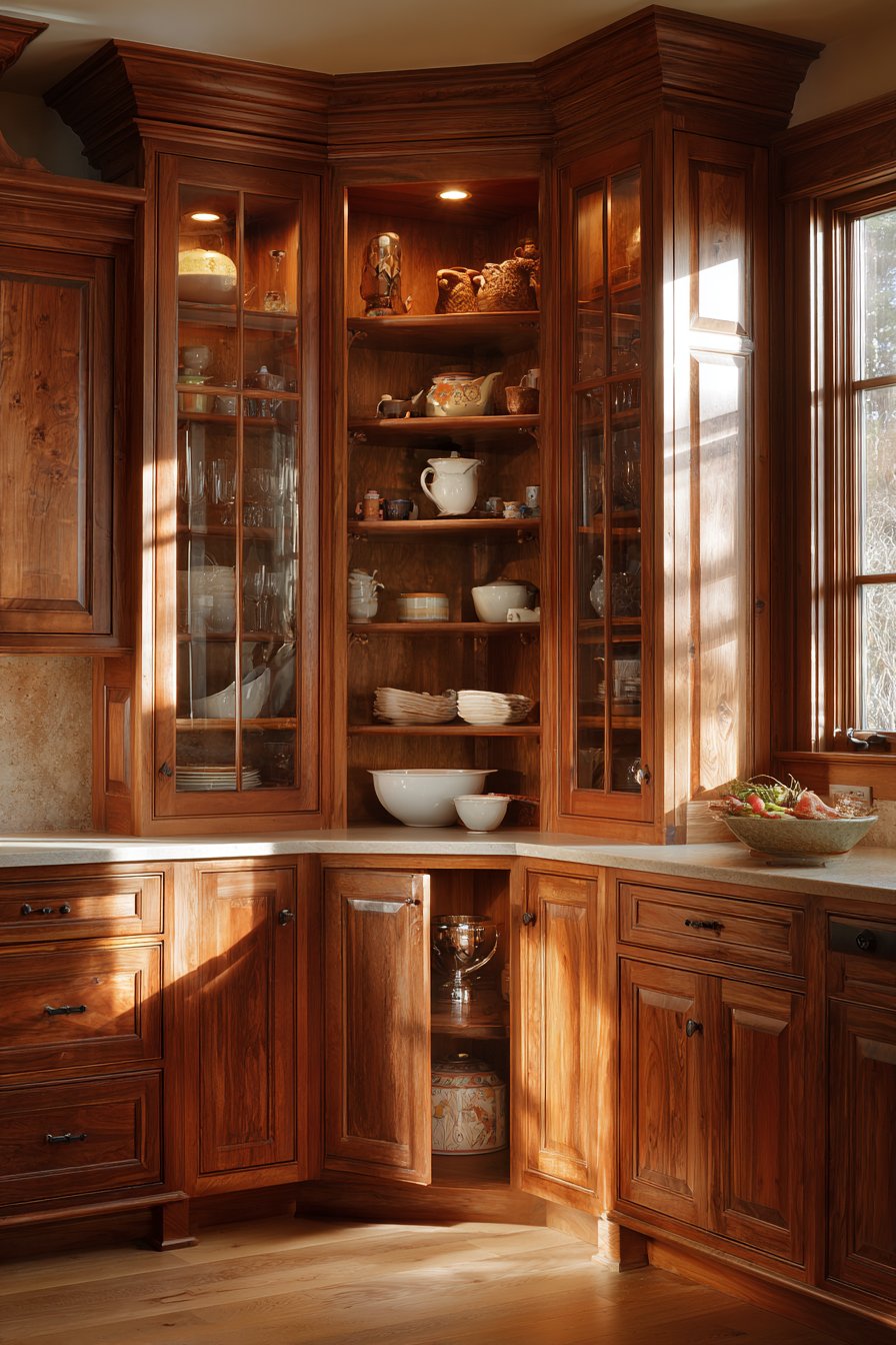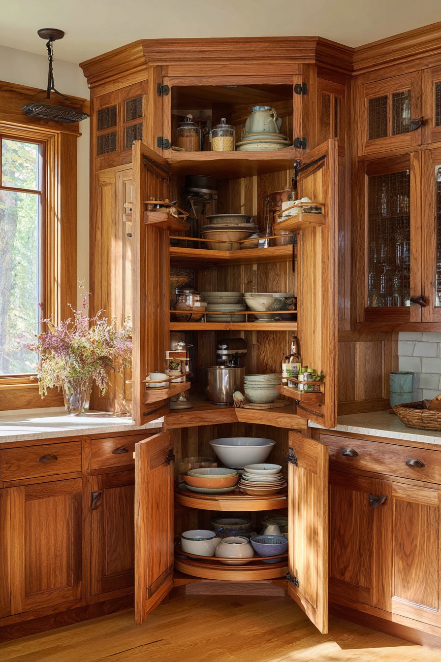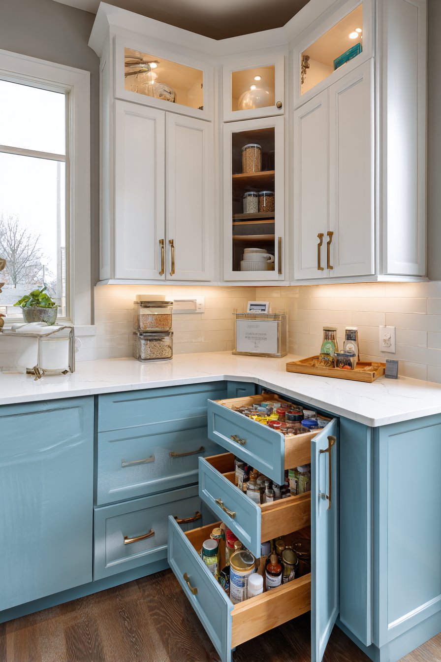 - Add vertical pull-out organizers flanking main corner cabinets for spices