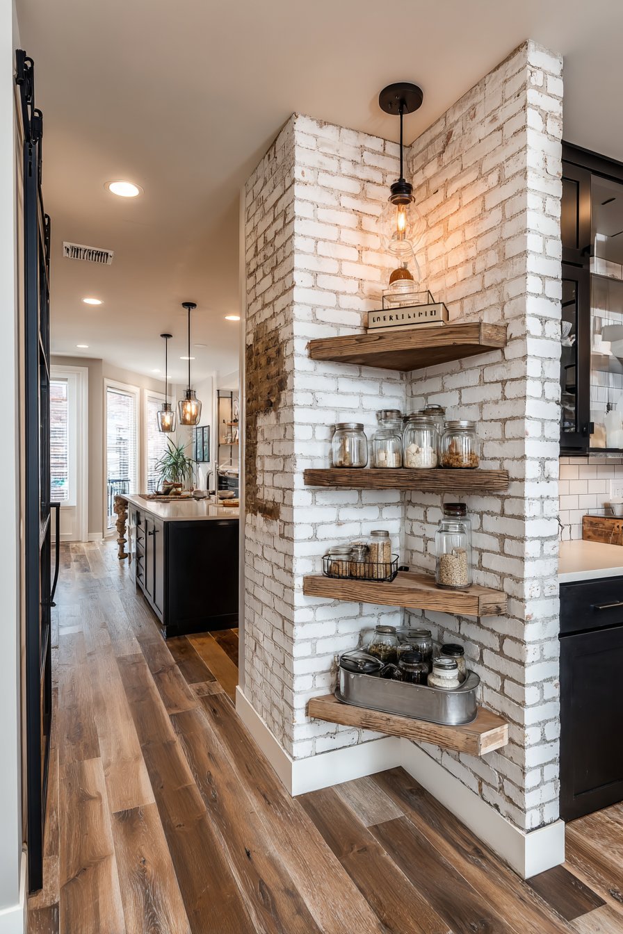 - Use rustic wood brackets for open shelving support