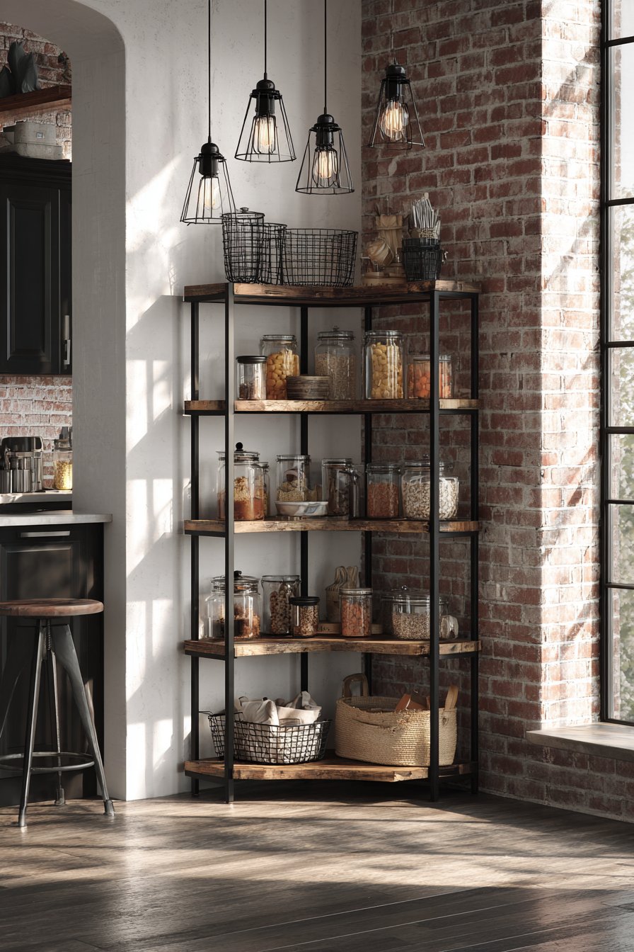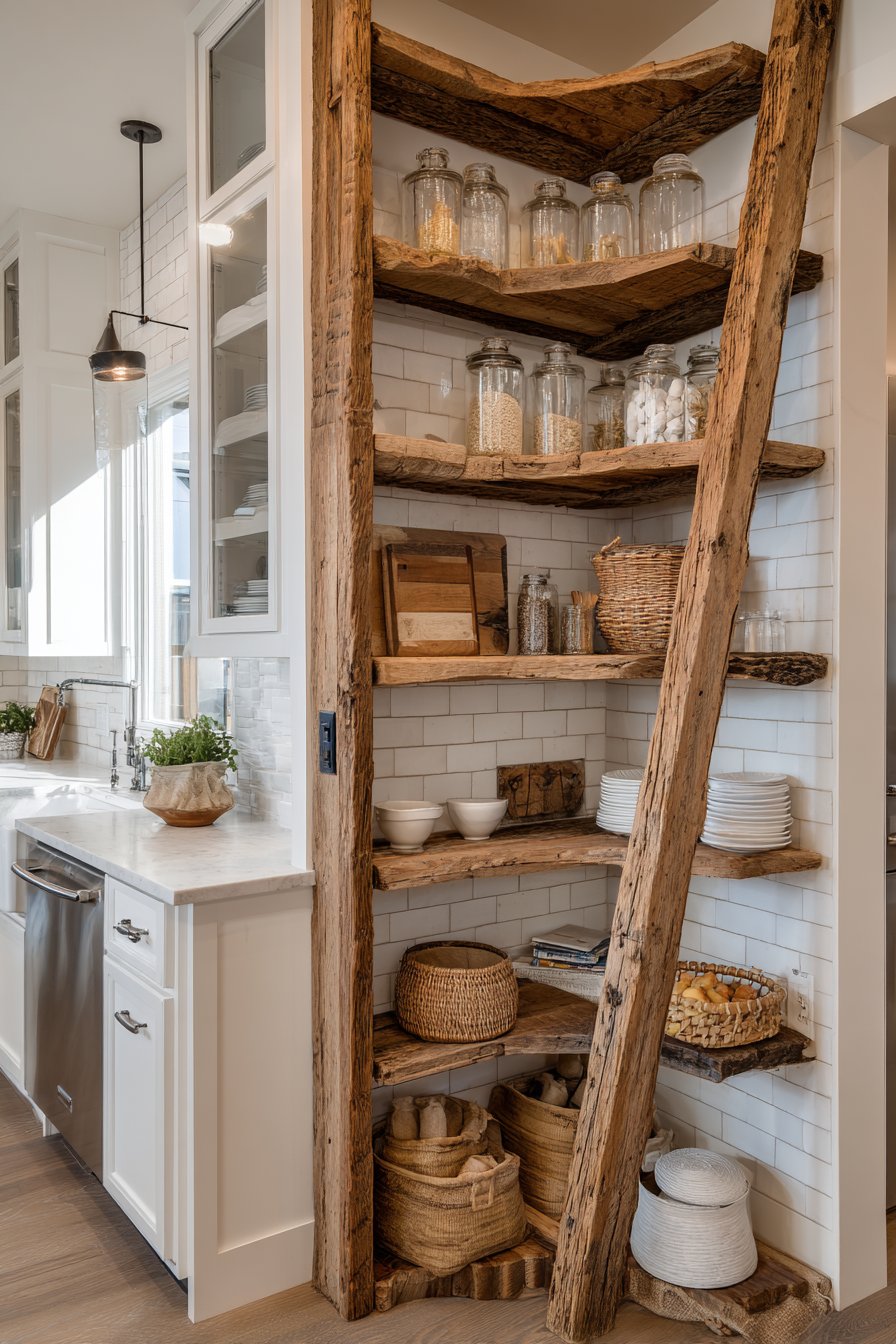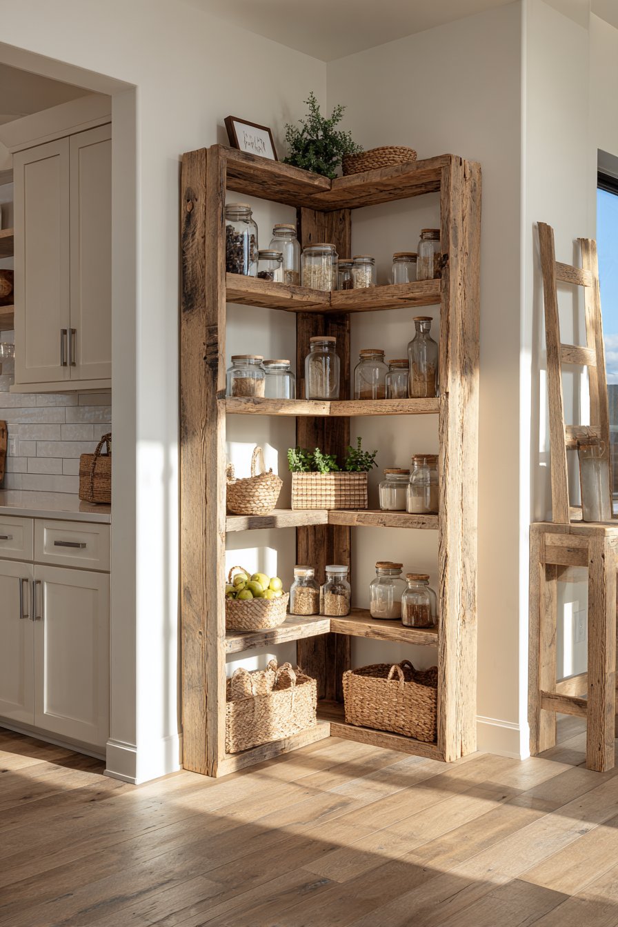 Reclaimed barnwood shelving with natural edge details creates authentic rustic character. The open corner shelving forms an L-shaped configuration filled artfully. Glass storage jars, woven baskets, and vintage ceramic containers provide textural storage. A ladder-style frame adds vertical interest and additional display opportunities.