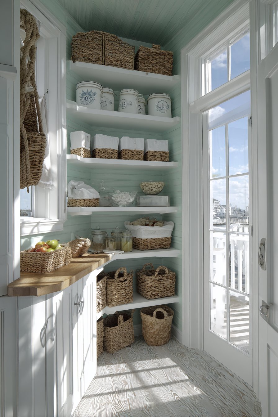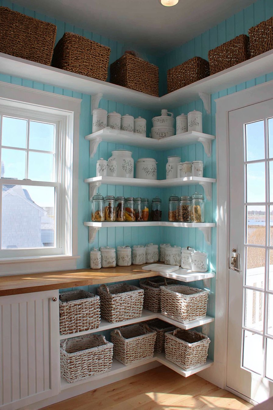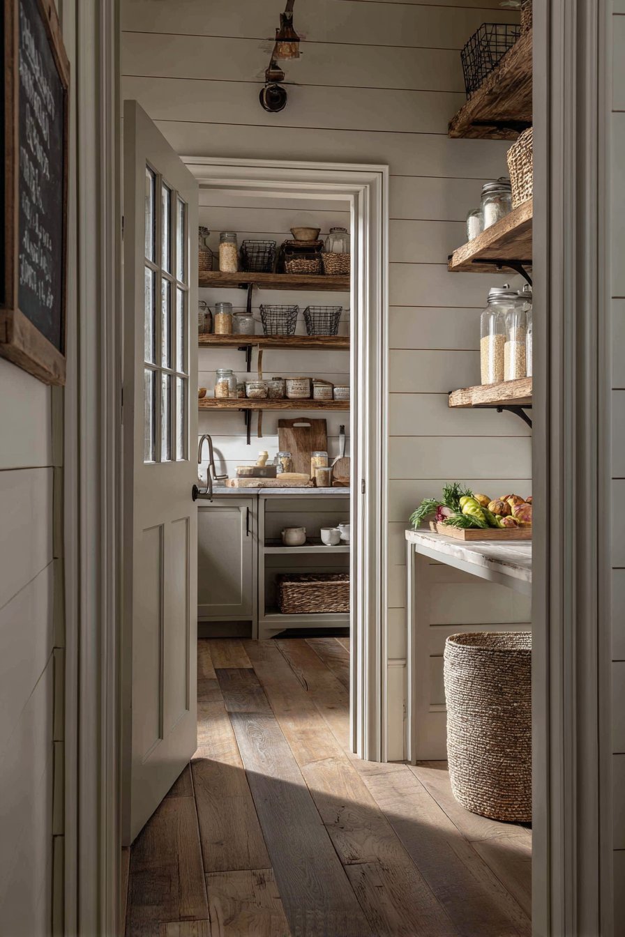 15. Farmhouse Shiplap Corner Pantry with Vintage Accents