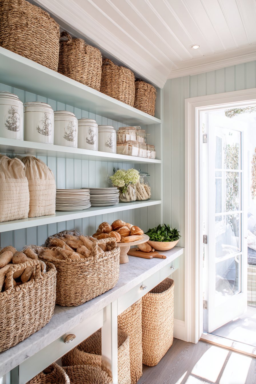 This farmhouse-style organization balances function with visual appeal beautifully. Woven baskets hold produce and bread with natural aesthetic harmony. Vintage ceramic containers add personality to practical storage needs. The integration into kitchen space feels seamless and thoughtfully planned.