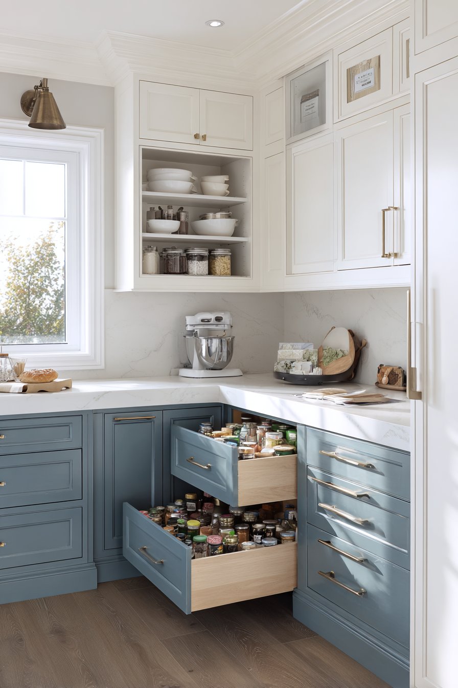 White upper cabinets and grey-blue lower cabinets create sophisticated two-tone design. The corner configuration includes a small built-in desk for meal planning. Pull-out drawers with custom inserts organize spices, oils, and baking supplies efficiently. Glass-front upper cabinets display white dishes while solid lowers conceal bulk storage.