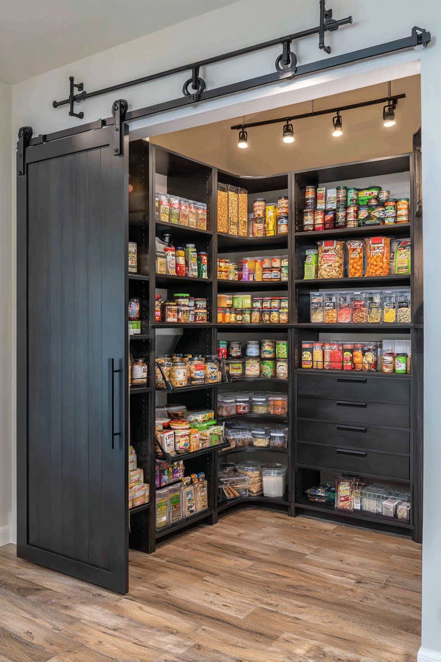 Lower drawer systems store root vegetables with appropriate ventilation features. Track lighting mounted on ceiling illuminates the entire corner pantry interior evenly. The sleek modern aesthetic showcases exceptional organizational planning and execution. Smooth-gliding barn door mechanisms operate effortlessly with quality hardware installation.