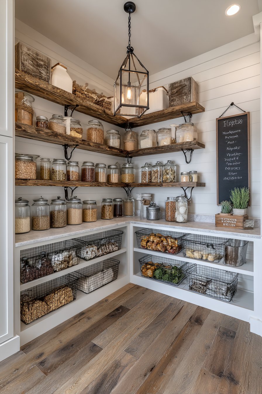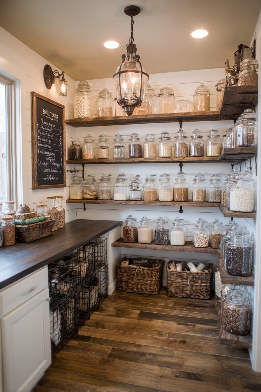 A small chalkboard mounted on walls lists pantry inventory for convenient tracking. Pendant lighting with antique bronze finish hangs above corner pantry area. Wide-plank oak flooring extends throughout kitchen into pantry space seamlessly. Gentle highlights on glass jars and metal containers create inviting atmospheres.