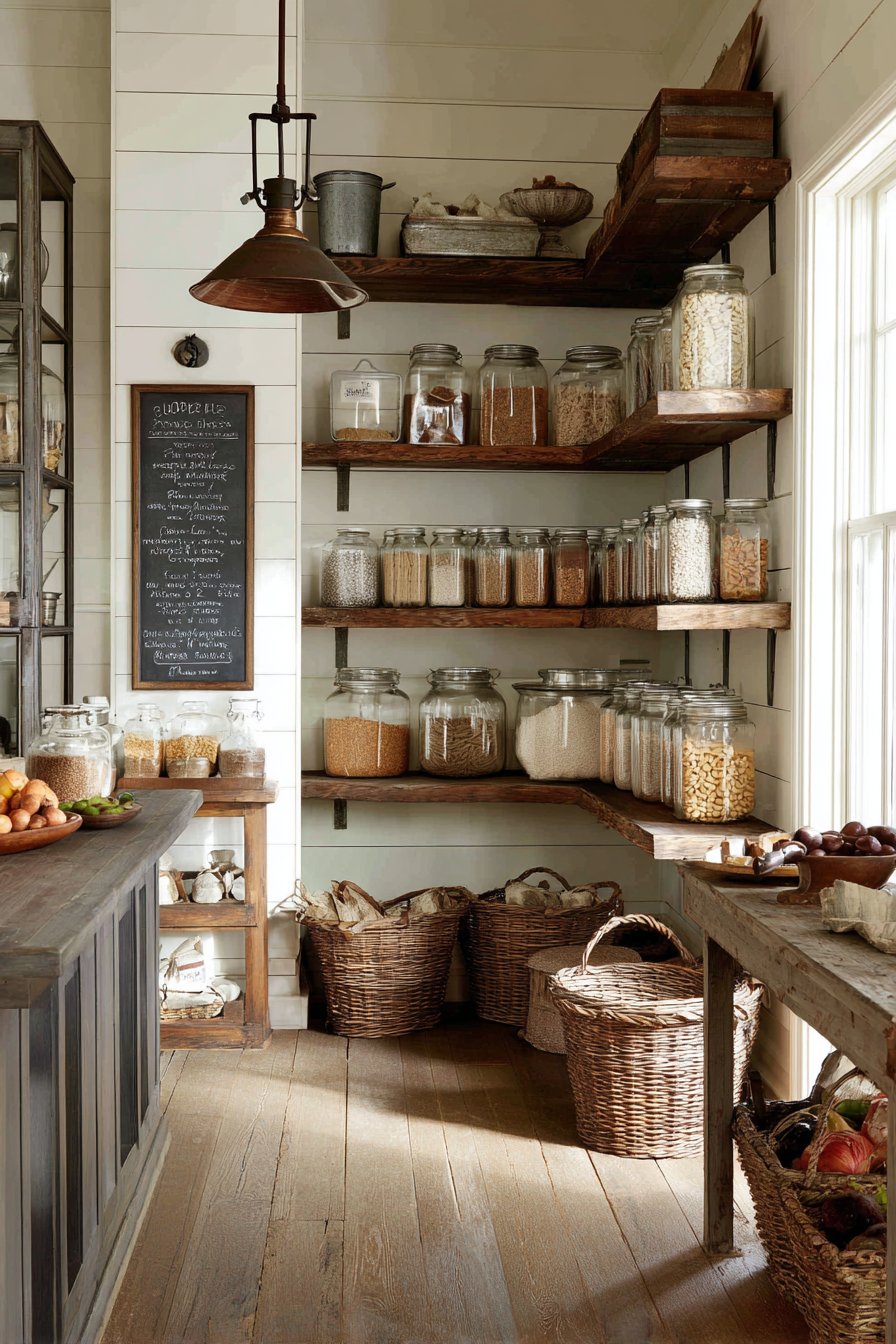 Shiplap walls painted warm white create charming farmhouse backdrop. Rustic wood bracket shelving forms L-shaped corner storage configuration. Vintage glass jars filled with dry goods display beautifully on open shelving. Galvanized metal containers and wire baskets hold fresh produce items.