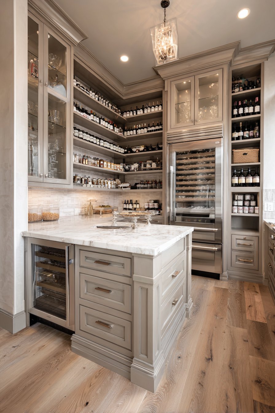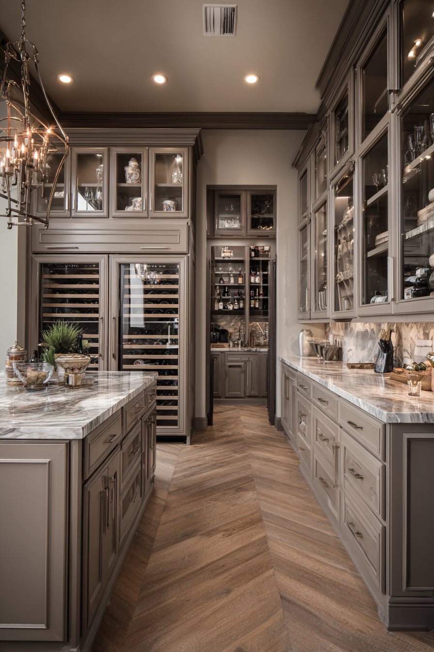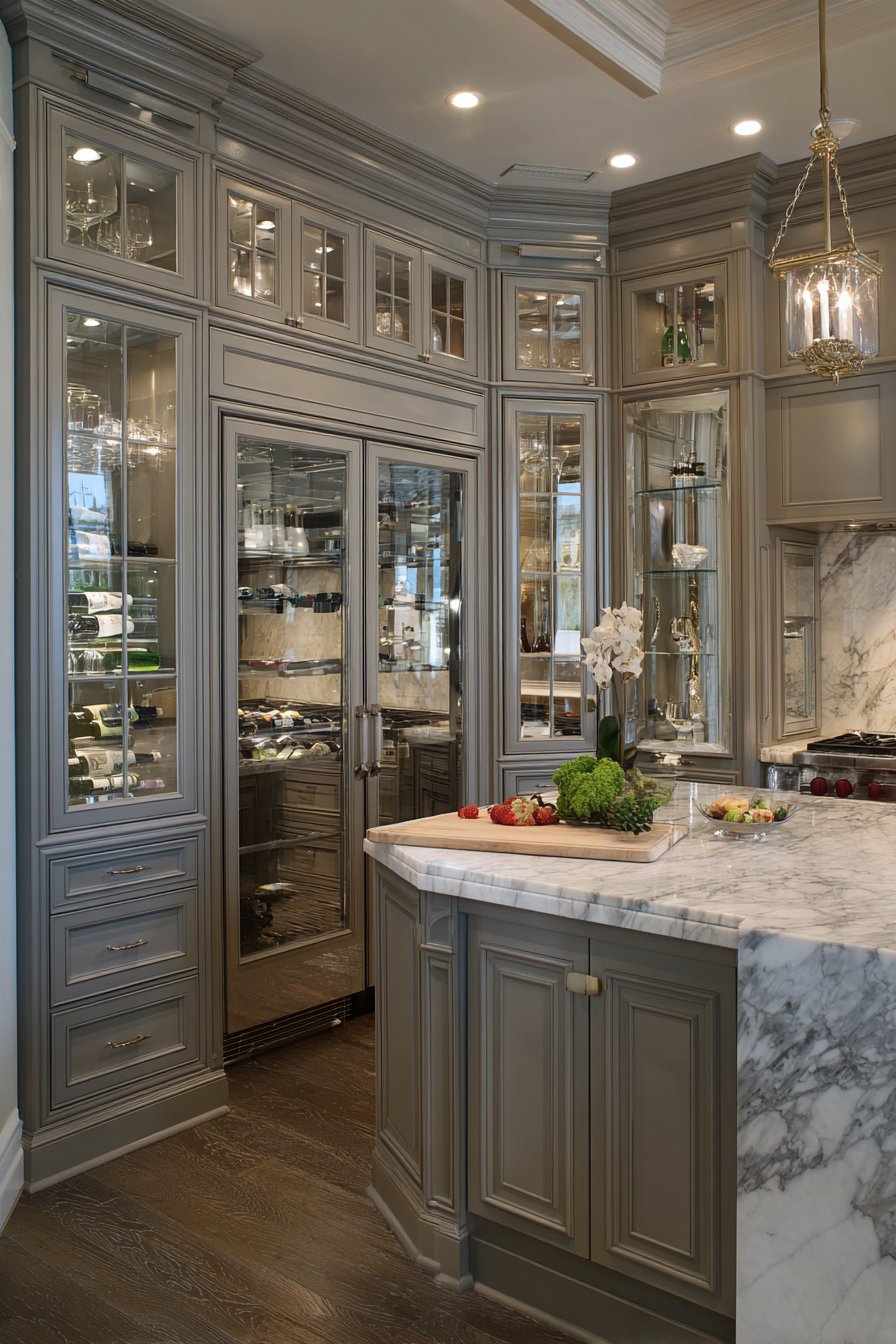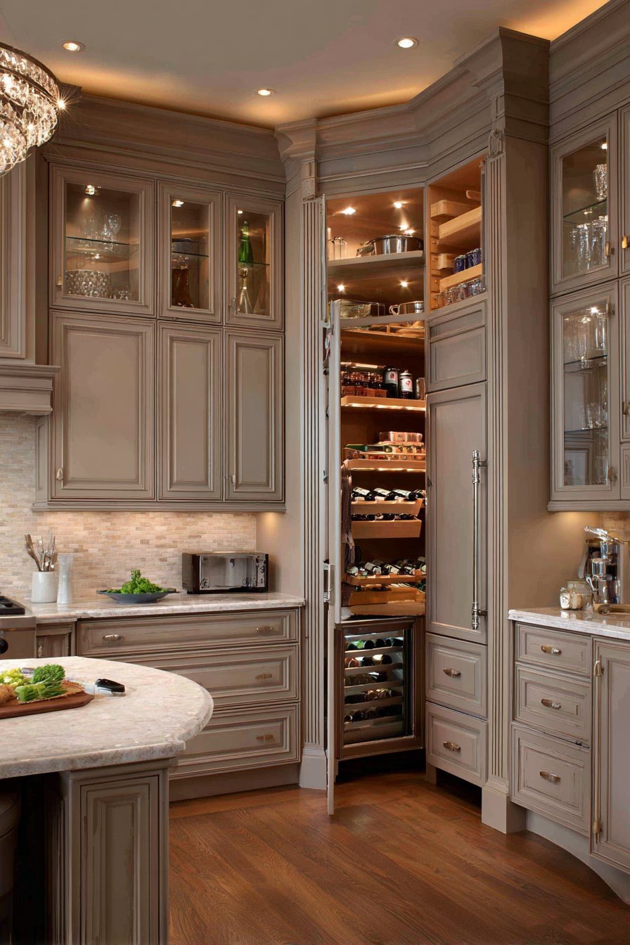 Floor-to-ceiling custom cabinetry in sophisticated taupe wraps seamlessly around corners. Glass-front upper cabinets and solid panel lowers create balanced storage solutions. The spacious corner pantry includes center island with marble preparation top. Additional drawer storage and wine refrigerator are integrated into island design.