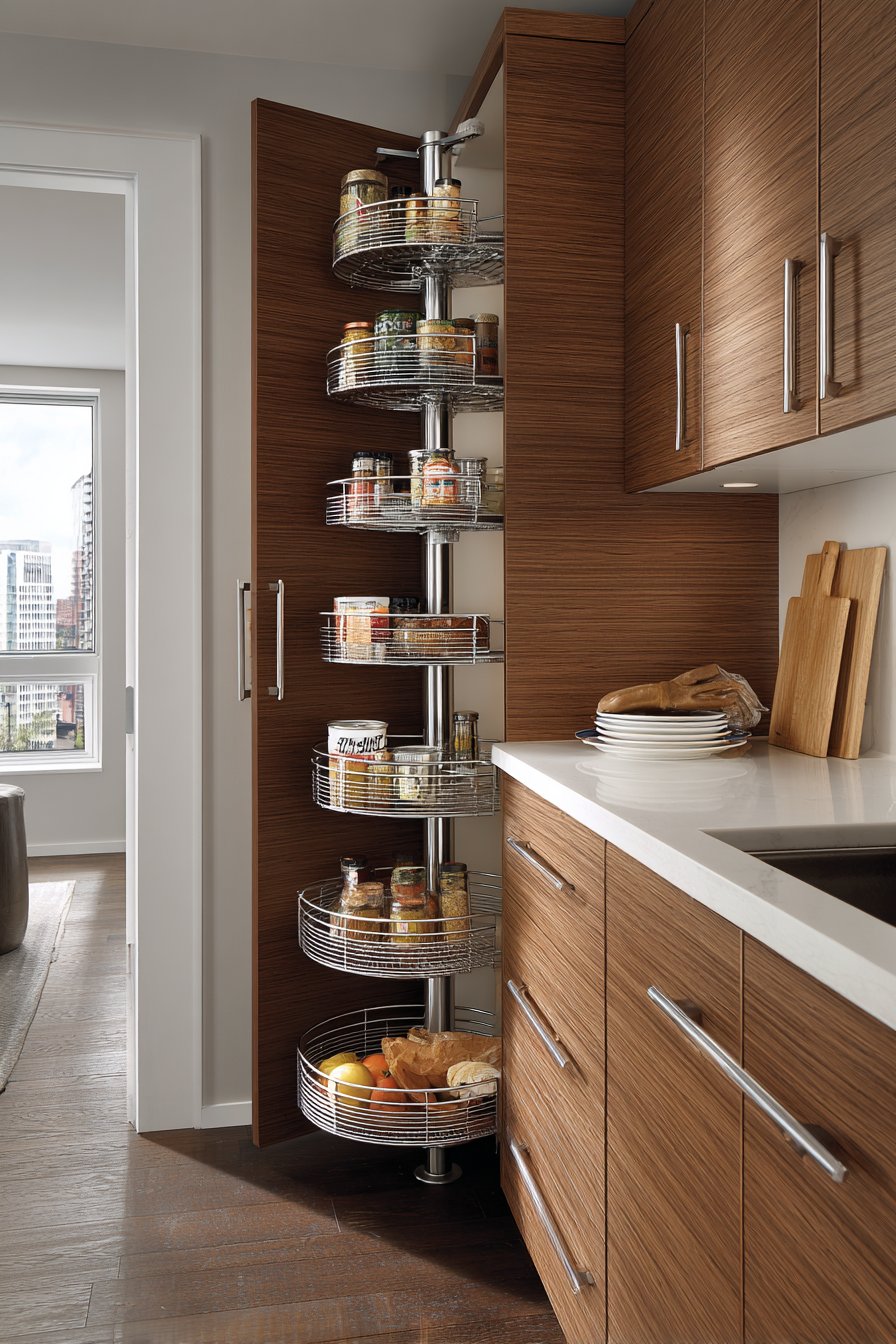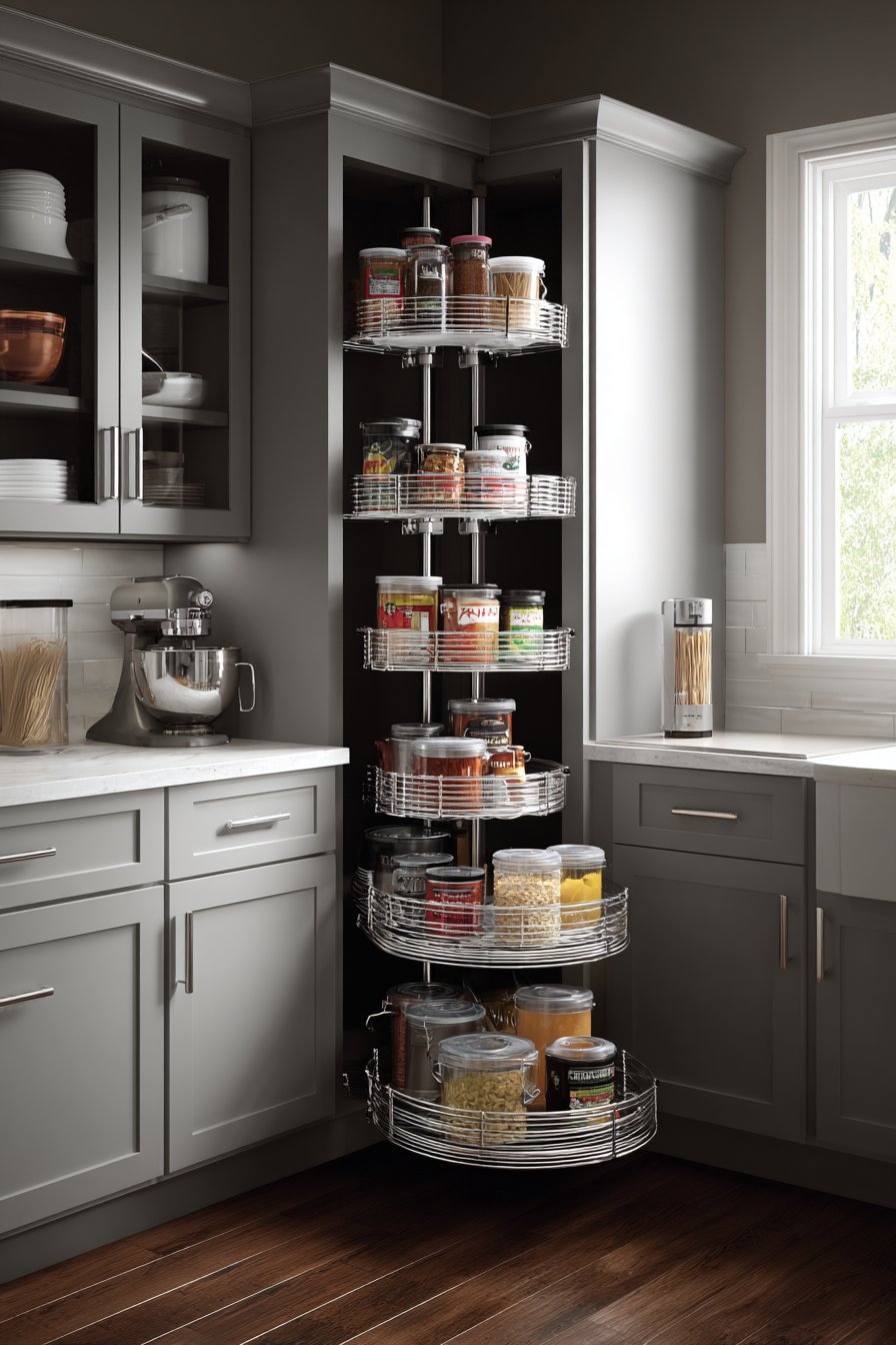 A tall corner cabinet with rotating carousel shelves maximizes vertical storage. The narrow corner pantry footprint suits compact apartment and condo kitchens. Five tiers of circular shelves spin independently for complete item visibility. Chrome center pole and shelf supports ensure smooth rotation mechanism.