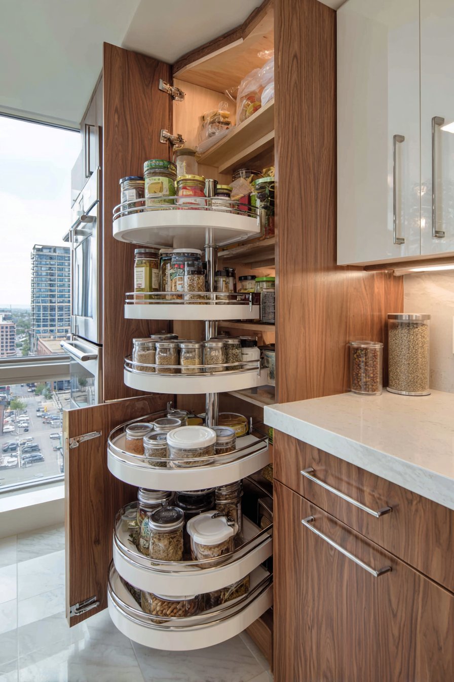 The engineering showcases innovative solutions for urban living challenges. Each rotating shelf holds neatly organized food items and cooking essentials. Full extension provides accessibility to every stored item without reaching. Balanced exposure highlights wood grain exterior and clean white interior surfaces.