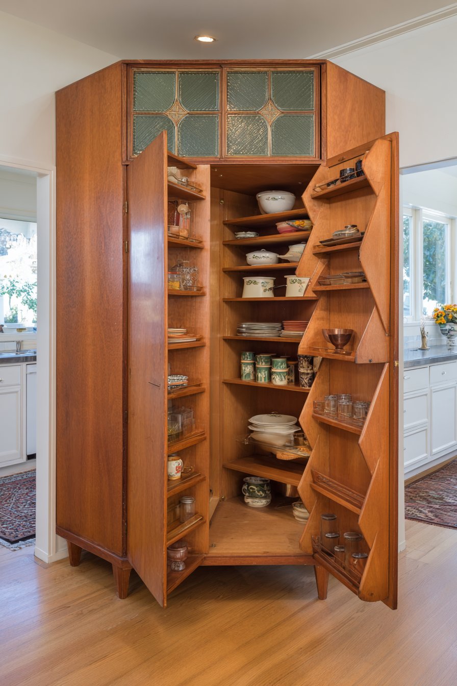 18. Mid-Century Teak Corner Pantry with Angled Doors
