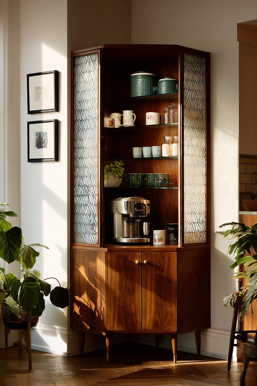 Vintage Pyrex containers and period-appropriate kitchen accessories display beautifully inside. Brushed brass hardware complements warm teak finish perfectly throughout. The angled corner doors maintain aesthetic principles while improving functionality. Warm natural light enhances rich teak grain and thoughtful integration.