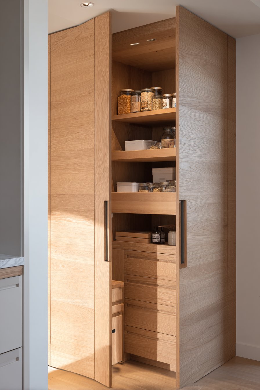 19. Minimalist Japanese-Inspired Oak Corner Pantry