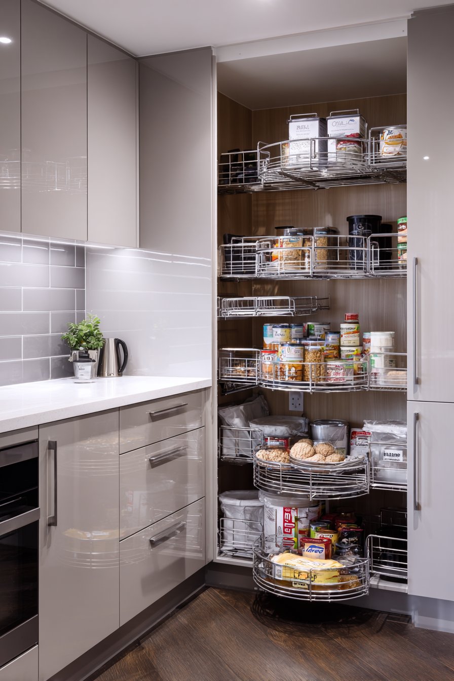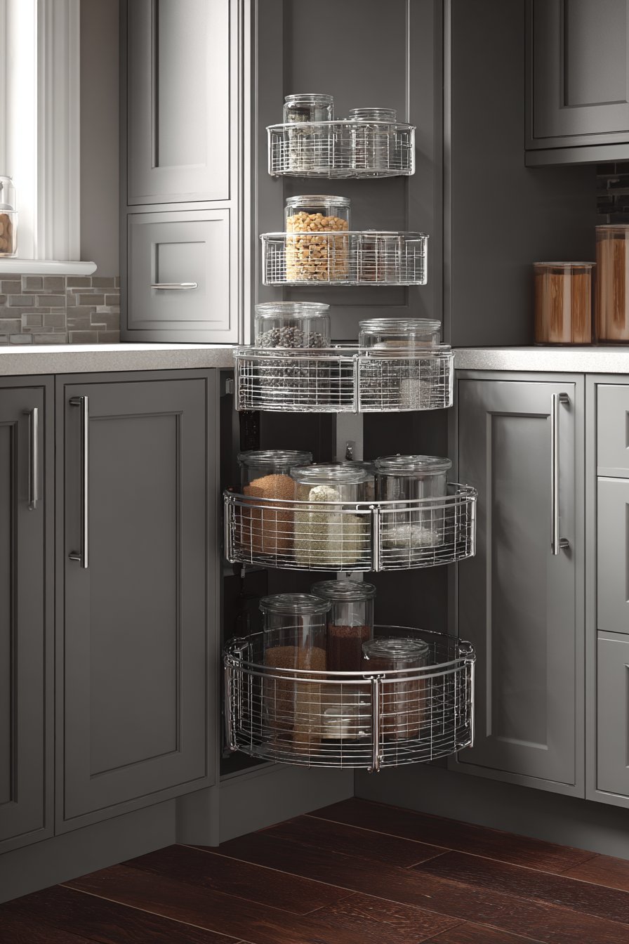 Chrome wire baskets arranged in diagonal configuration define this compact contemporary solution. The innovative lazy susan mechanism allows full access to deep corner storage. Each rotating tier holds organized food containers and kitchen essentials efficiently. Sleek grey laminate surrounding cabinetry features integrated push-to-open hardware.