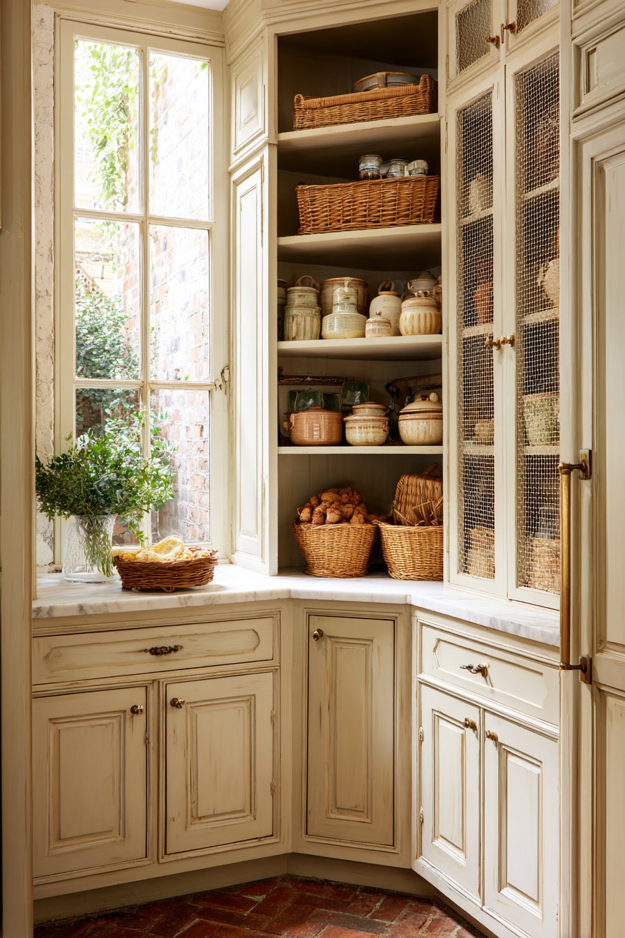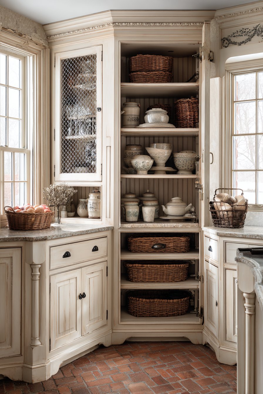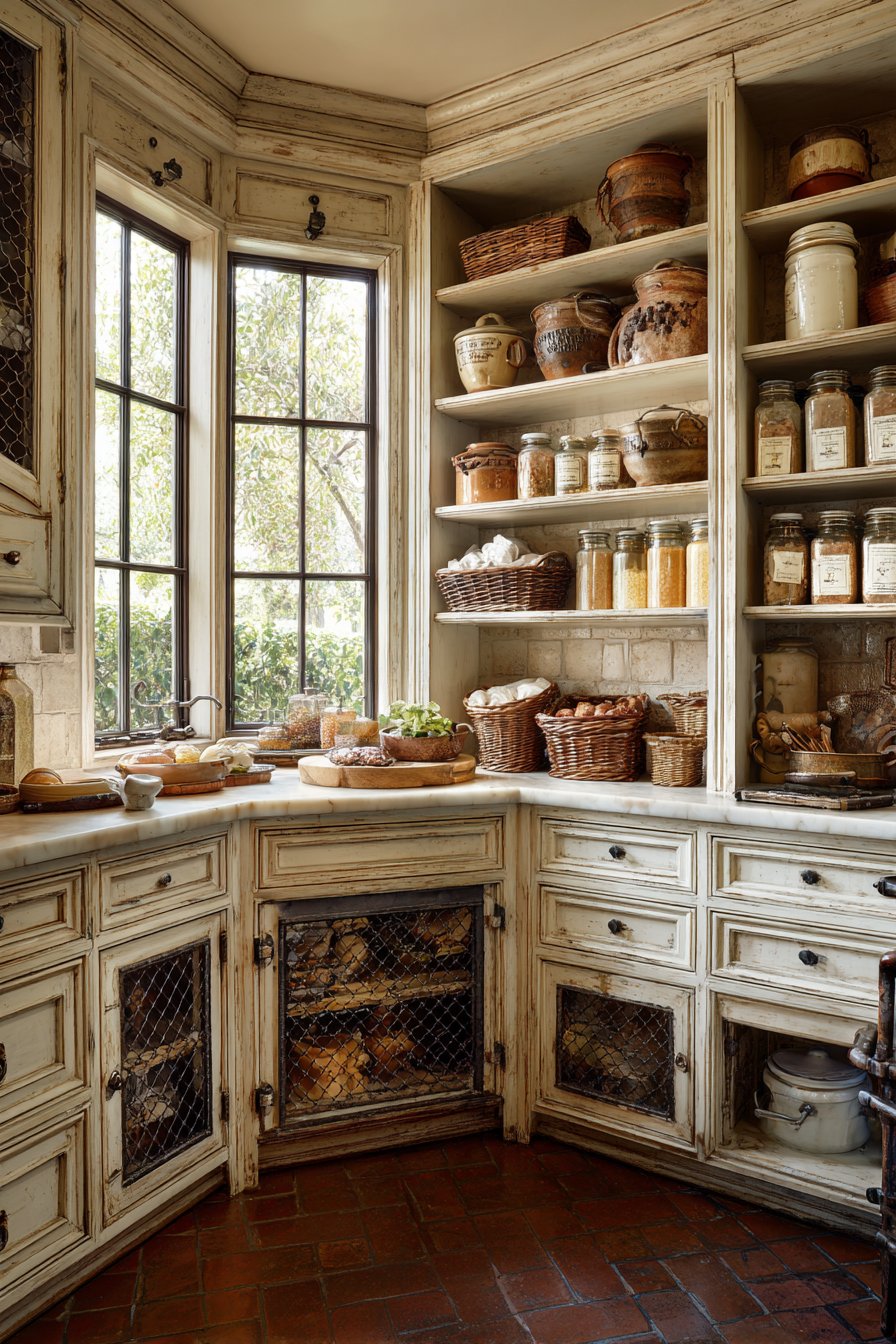 Cream-painted wood cabinetry features detailed molding and chicken wire mesh inserts. The mesh door inserts allow ventilation while displaying organized contents beautifully. Deep base cabinets and shallow upper shelving wrap around kitchen corners. Pottery crocks, wicker baskets, and vintage tins are arranged artfully throughout.