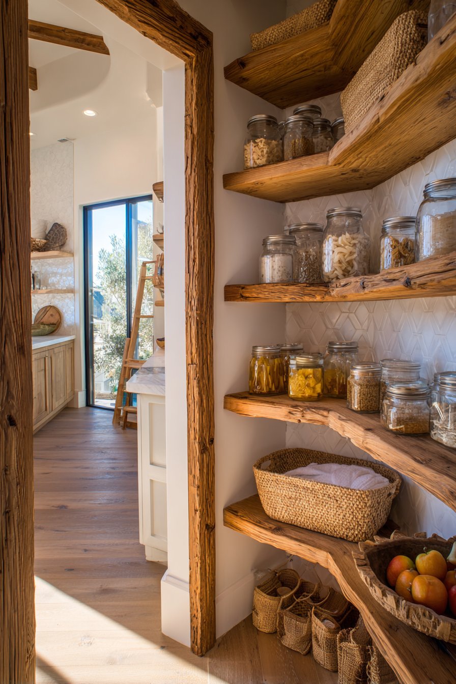 Natural wood grain variations tell stories of the material’s previous life. White subway tile backsplash provides clean contrast to warm wood tones. Afternoon light creates gentle shadows that emphasize reclaimed wood texture. The organic arrangement of pantry items feels intentional yet relaxed.
