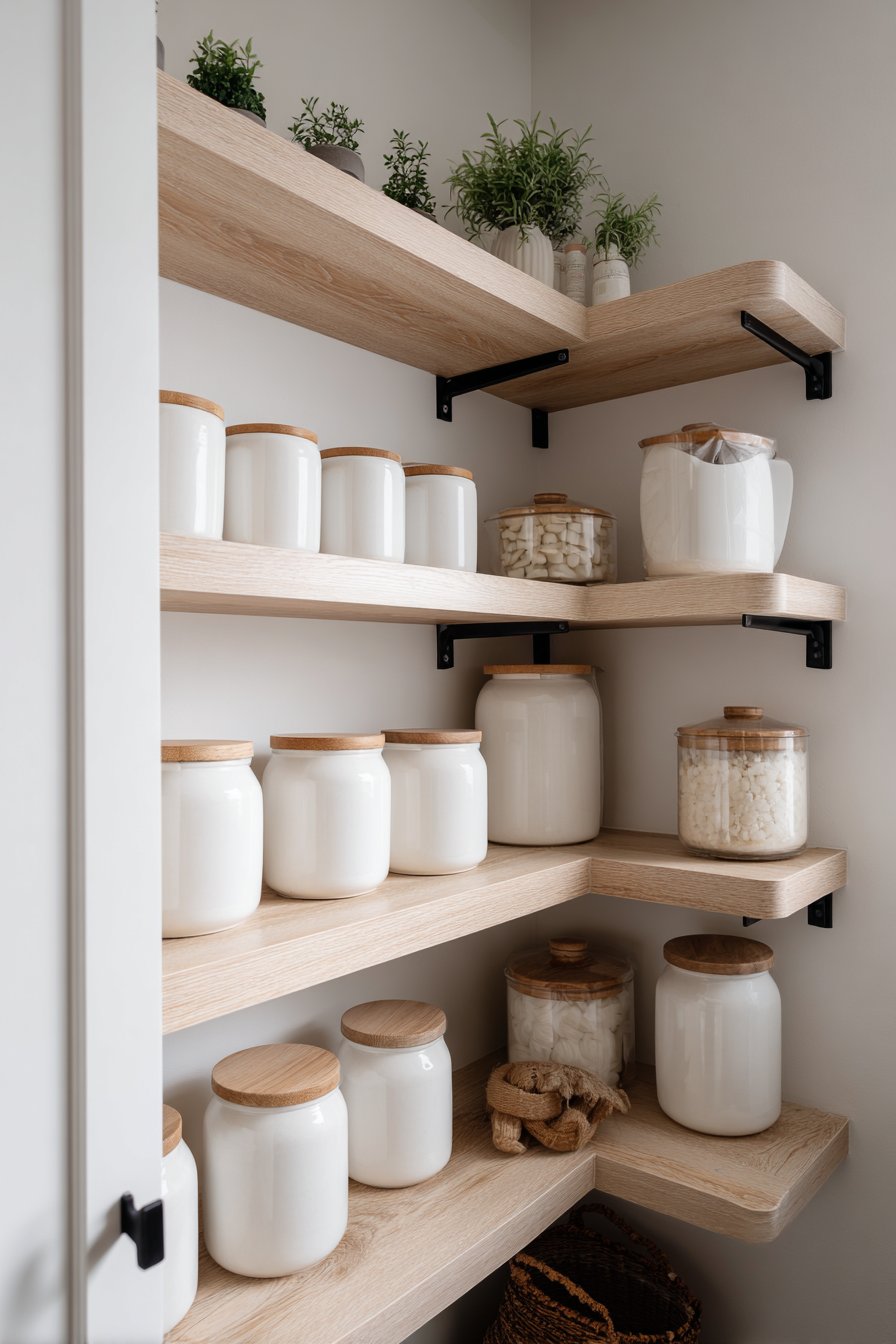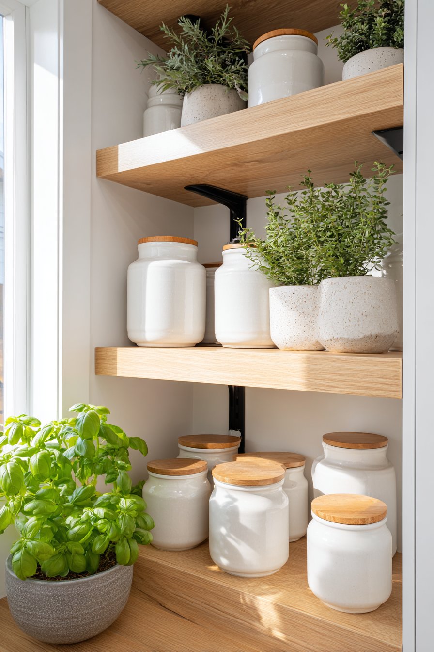 Light oak floating shelves arranged in stepped configuration wrap gracefully around wall intersections. Minimalist white ceramic containers with wooden lids create cohesive storage systems. Small potted herbs on upper shelves add fresh greenery and functionality. Varying shelf depths accommodate different-sized items efficiently.