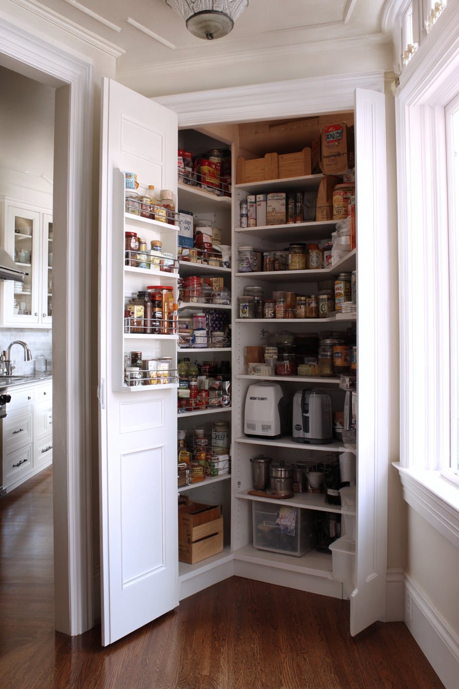 White painted bi-fold doors open to reveal extensively organized corner pantry interiors. Adjustable wire shelving systems fit custom to corner space dimensions. Deep shelves on one wall transition smoothly to narrower adjacent shelves. Labeled clear containers, boxed goods, and small appliances fill available space.