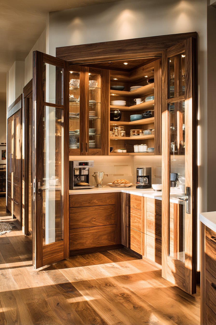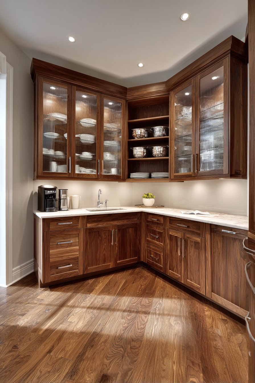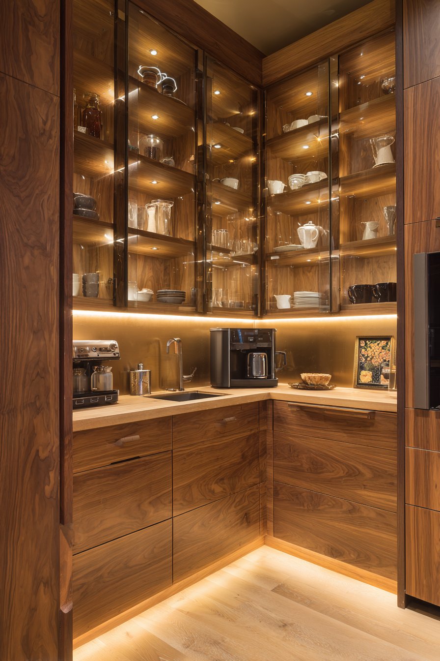 Floor-to-ceiling custom walnut cabinetry wraps seamlessly around corner walls. Glass-front upper cabinets and solid panel lower cabinets balance display and concealment. The spacious corner pantry includes a center island with marble preparation surface. Built-in coffee station features under-cabinet lighting and dedicated equipment storage.