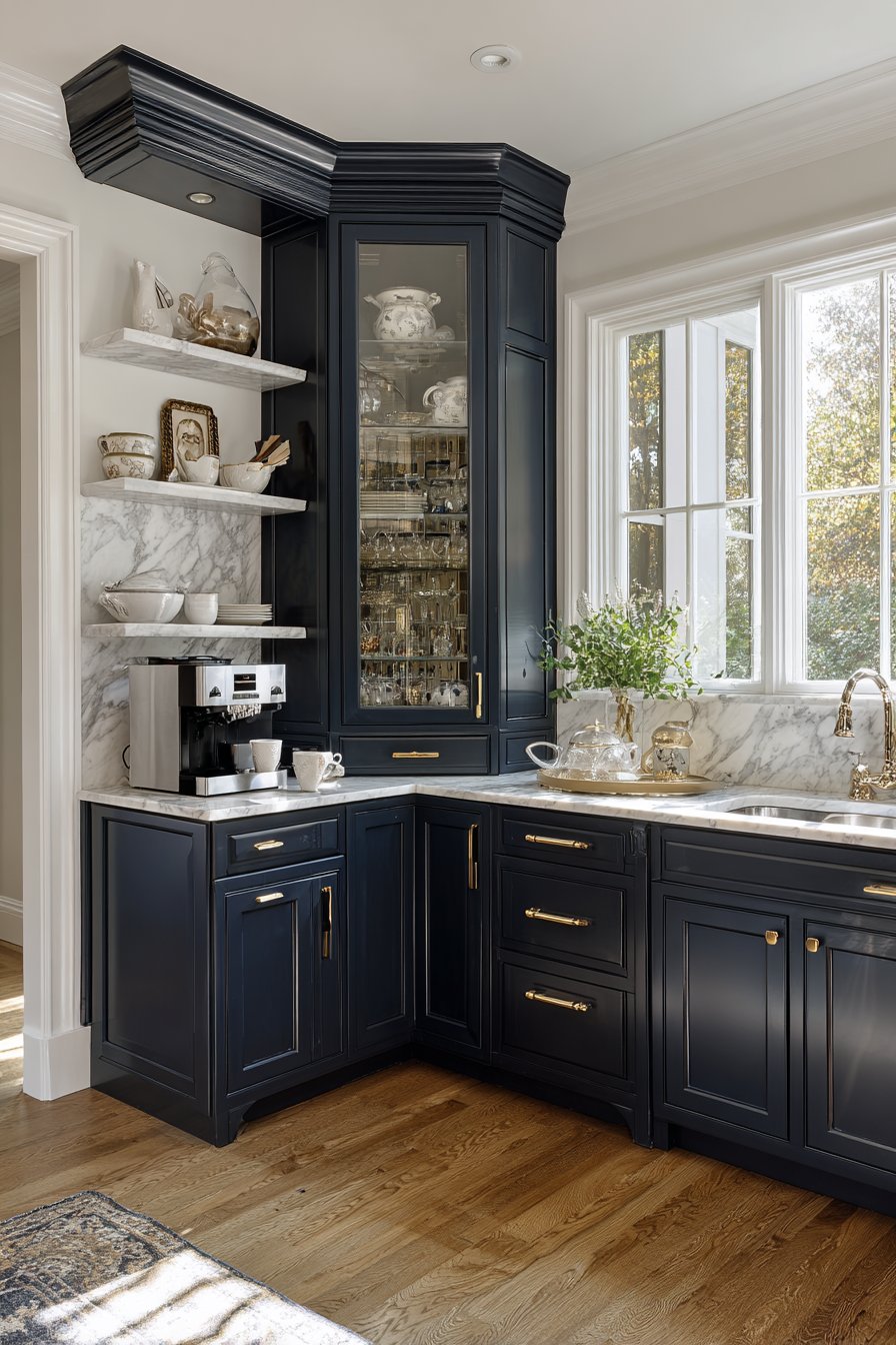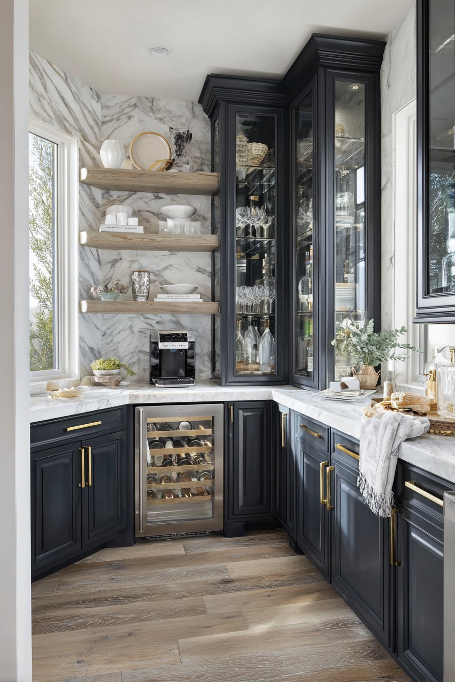 Gold hardware and fixtures complement the sophisticated navy color palette perfectly. Open shelving in corners displays decorative serving pieces artfully. Closed cabinets below provide concealed storage for less attractive items. This butler’s pantry creates functional transitions between kitchen and dining spaces.