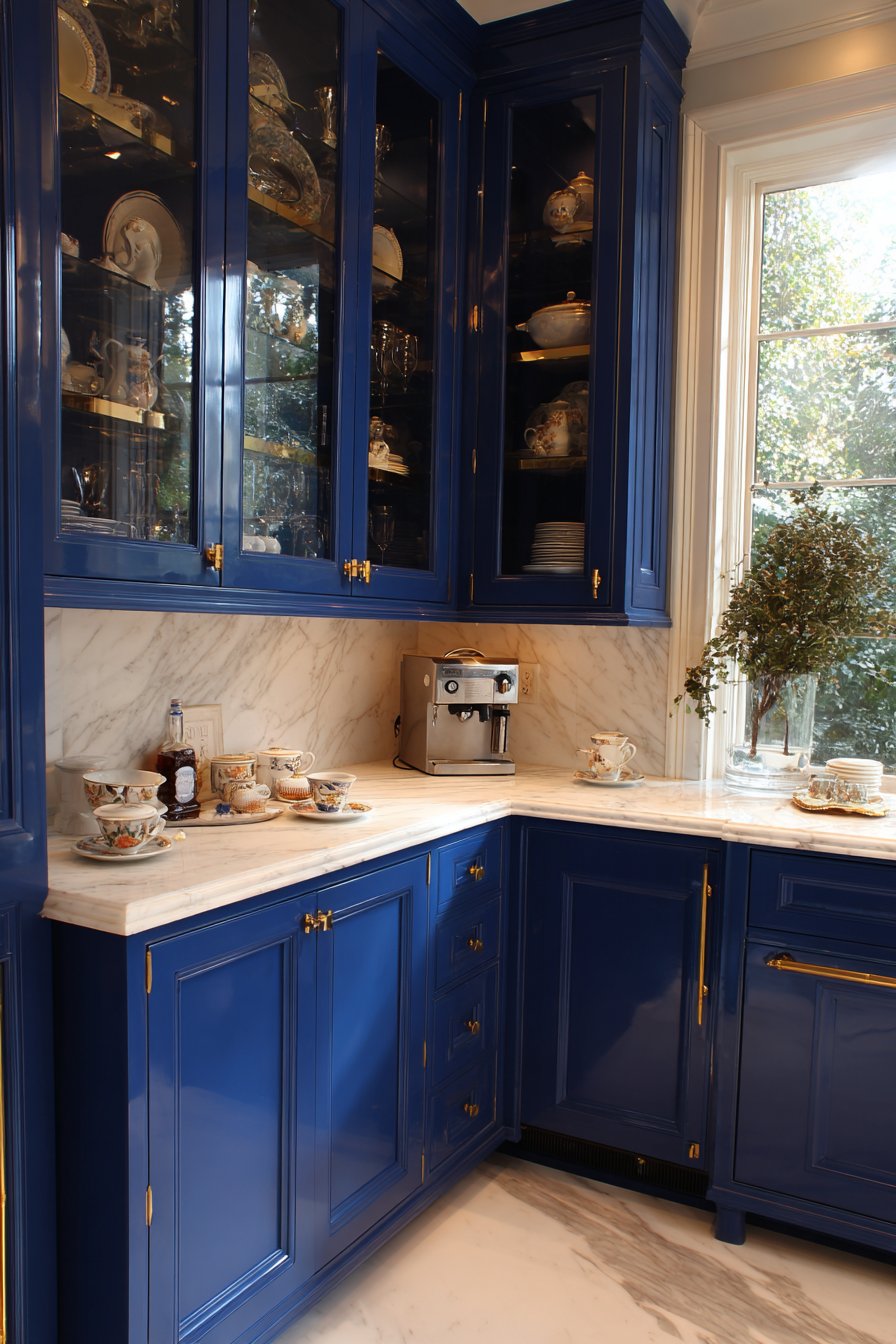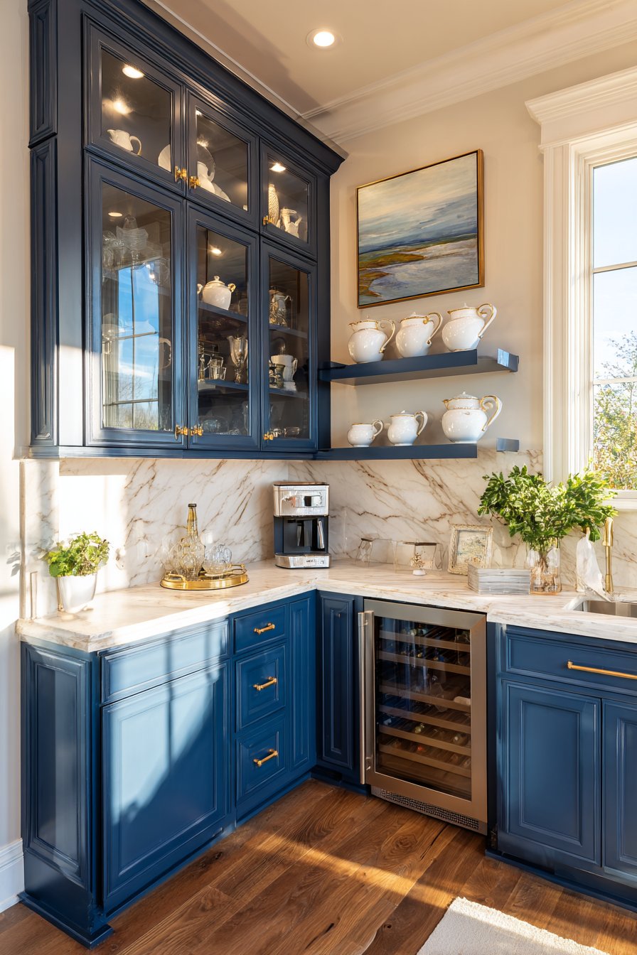 Wraparound marble countertops feature corner sink configurations in this elegant space. Floor-to-ceiling glass-front cabinetry showcases rich navy blue finish beautifully. The corner pantry area serves multiple functions as beverage preparation station. Under-counter wine refrigerators, glassware storage, and coffee equipment occupy dedicated zones.