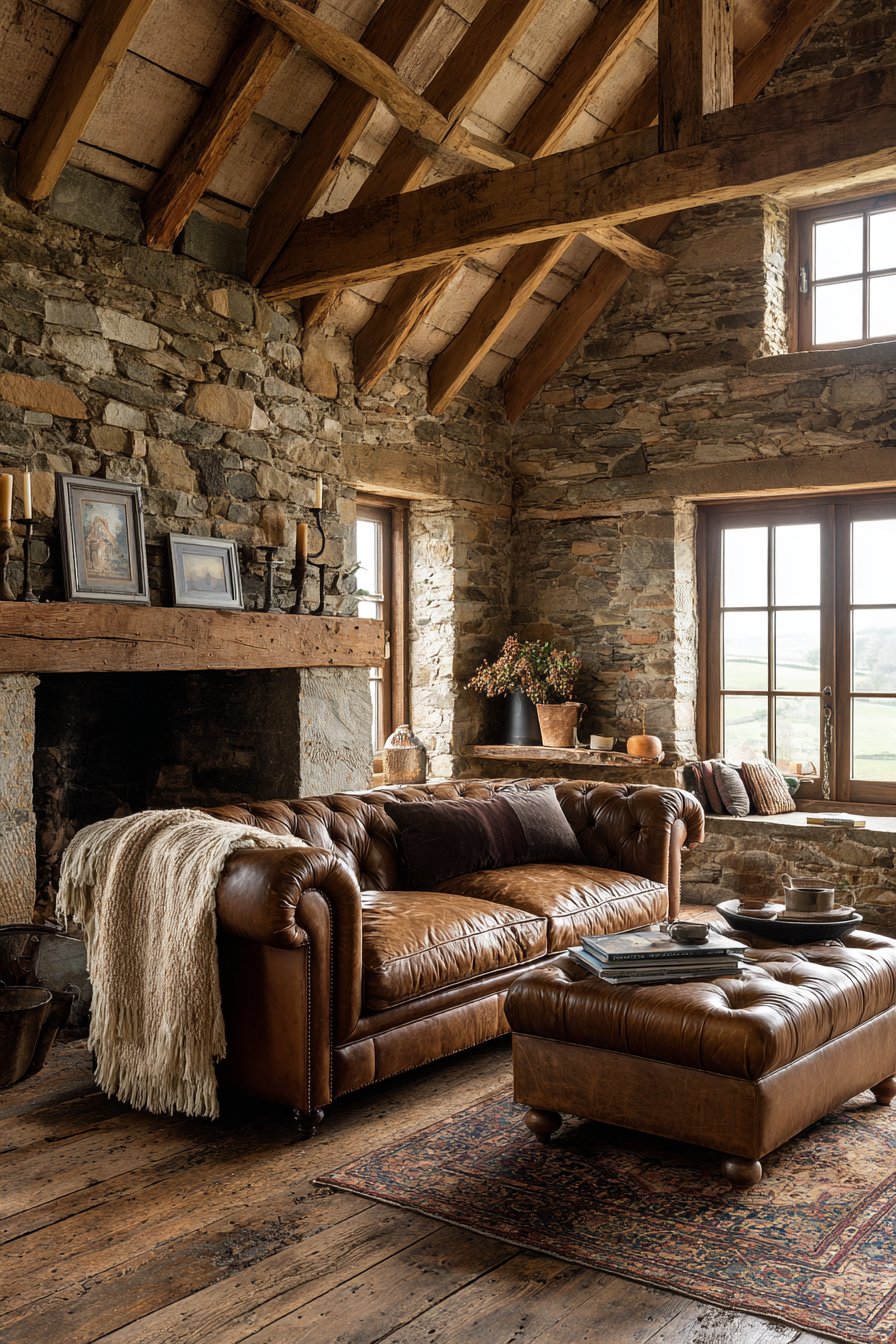 1. Stone Fireplace with Leather Chesterfield Elegance