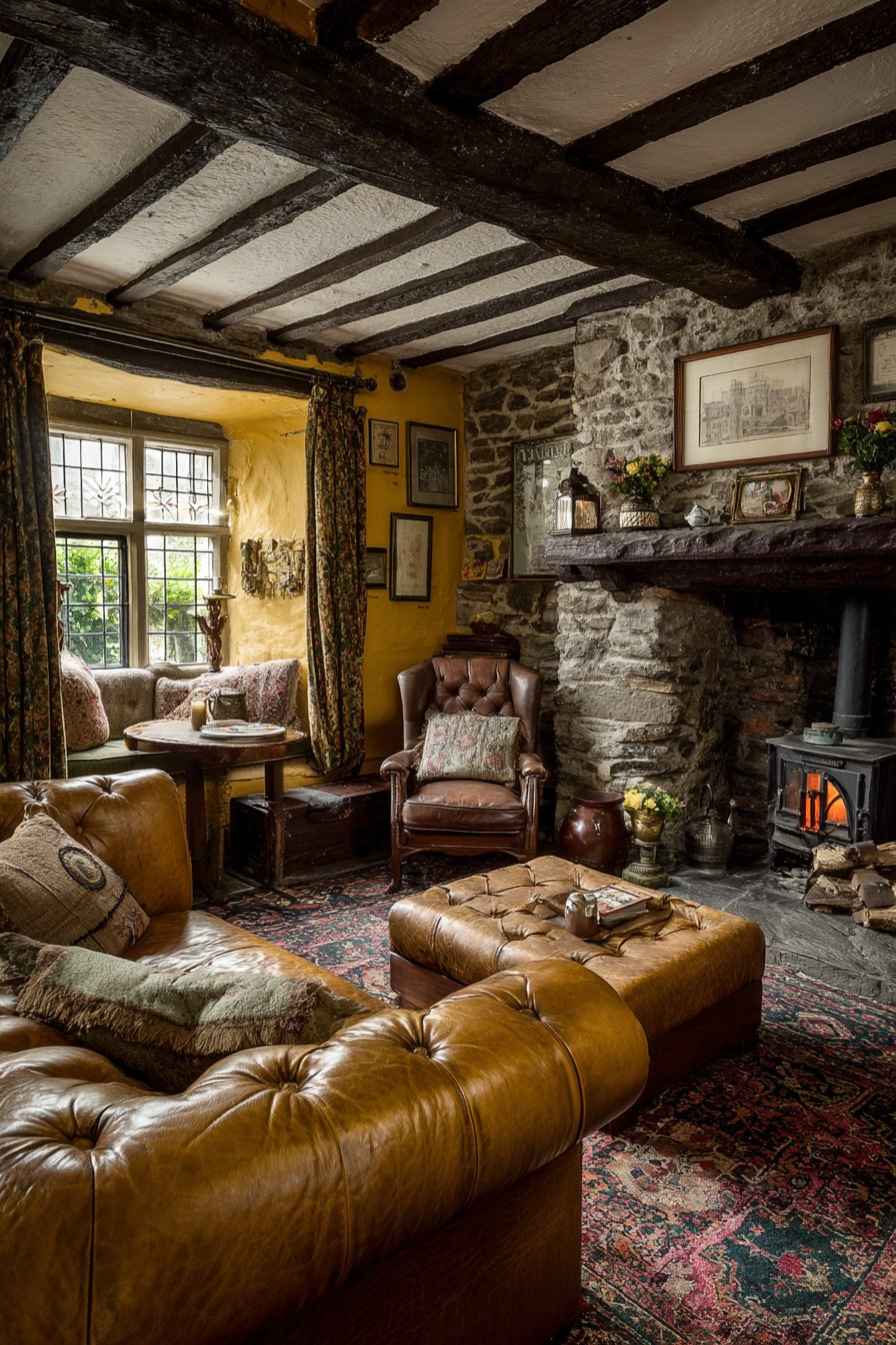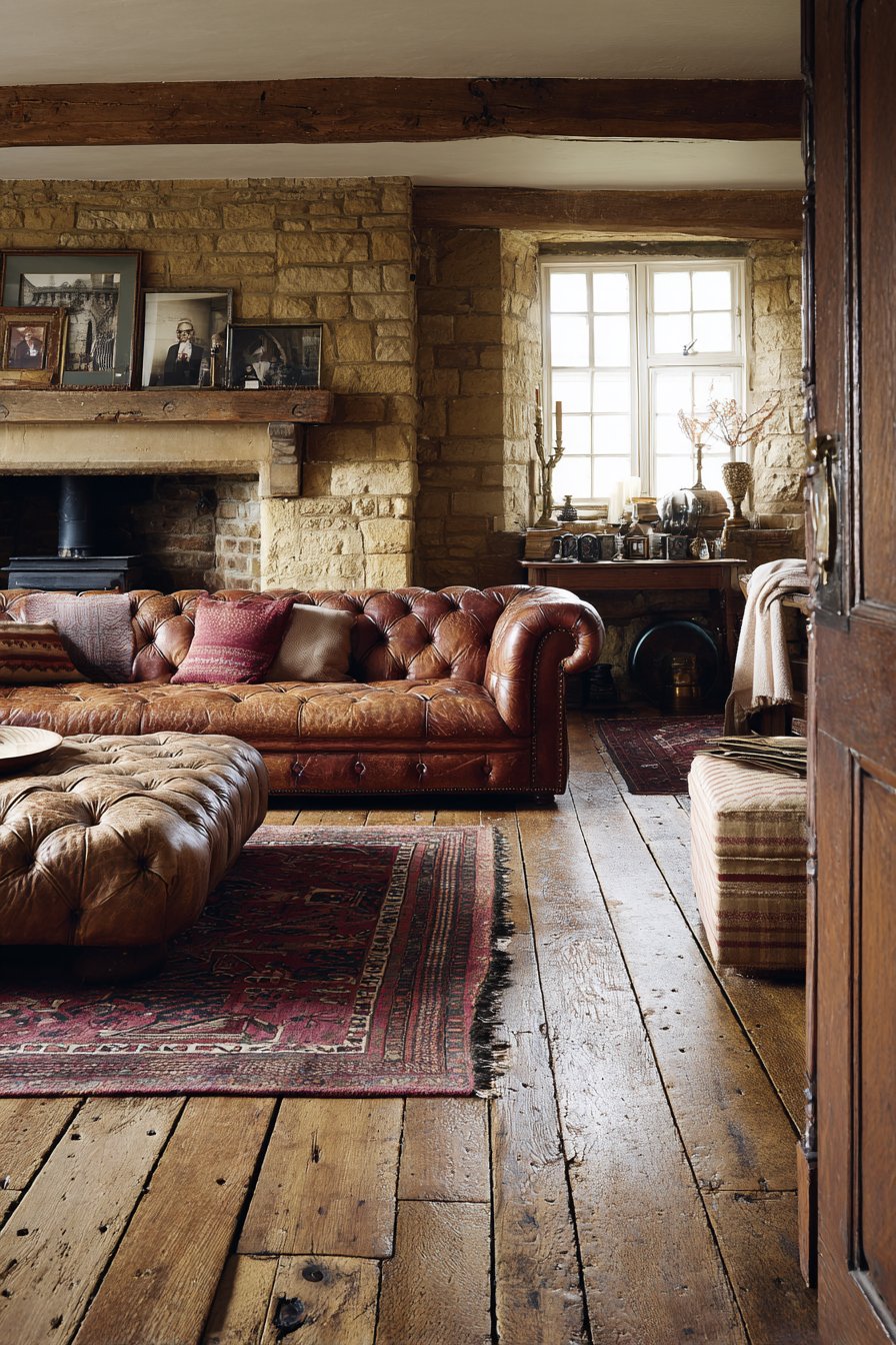 The stone fireplace anchors this classic cottage living room with undeniable presence and warmth. A reclaimed oak mantel crowns the hearth, displaying family photographs and vintage brass candlesticks. The worn leather Chesterfield sofa in rich cognac faces the fireplace directly. Its deep button tufting and rolled arms embody timeless comfort. A tufted ottoman provides additional seating or serves as a casual footrest.