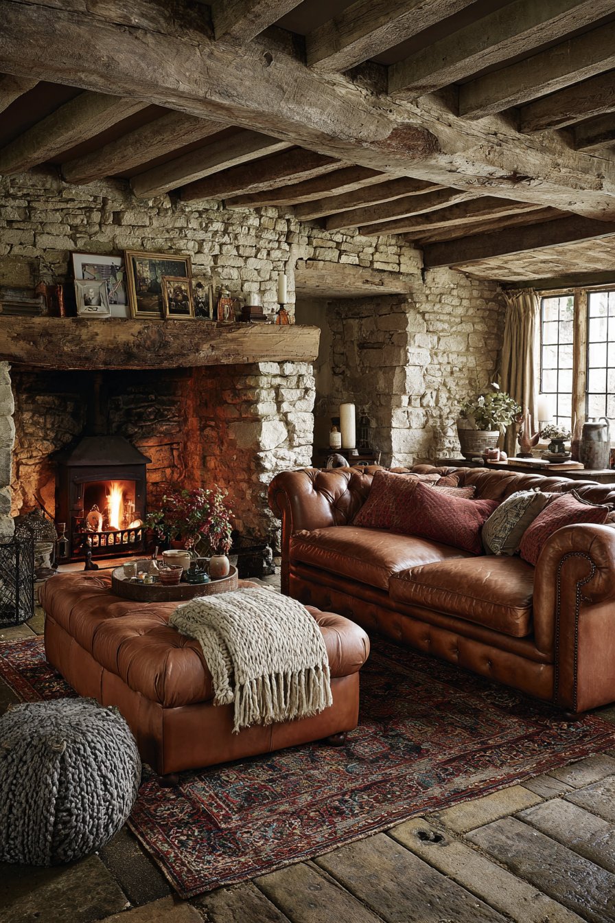 The leather develops a beautiful patina over time, becoming more characterful with age. Handwoven wool throws in cream and rust tones drape casually over the sofa. These textiles add warmth both visually and physically. The stone fireplace provides genuine focal point drama while offering functional heating during colder months.