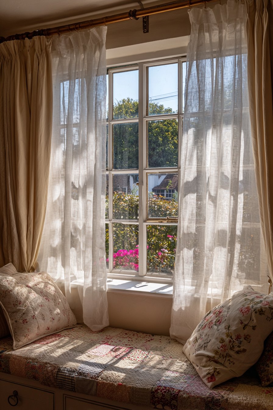 A cushioned window seat below features storage compartments accessed by lifting the seat. Vintage floral cushions and a patchwork quilt dress the seating area. Morning light filters through sheer under-curtains in cotton voile. This layered approach controls light while maintaining privacy. The gentle folds of the linen curtains create soft sculptural forms.