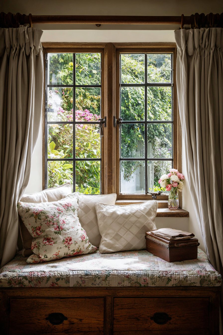 - Upholster window seats in durable linen fabrics with cottage-appropriate patterns