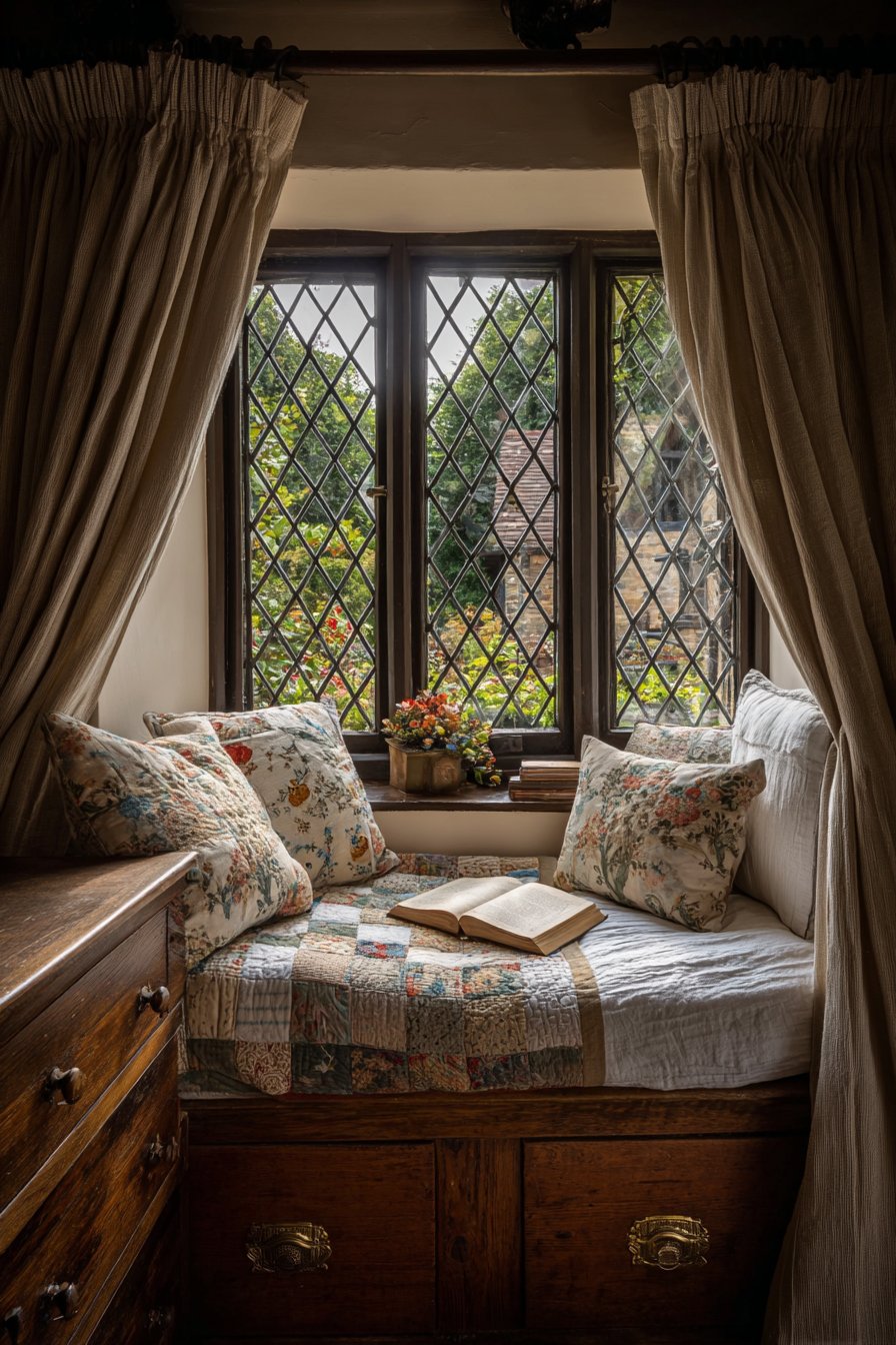 Bay windows create natural reading nooks by providing three-sided natural light. The architectural feature adds square footage without expanding the cottage footprint. Button tufting adds traditional upholstery detail while providing cushion structure. Vintage floral fabrics suit cottage aesthetics perfectly.