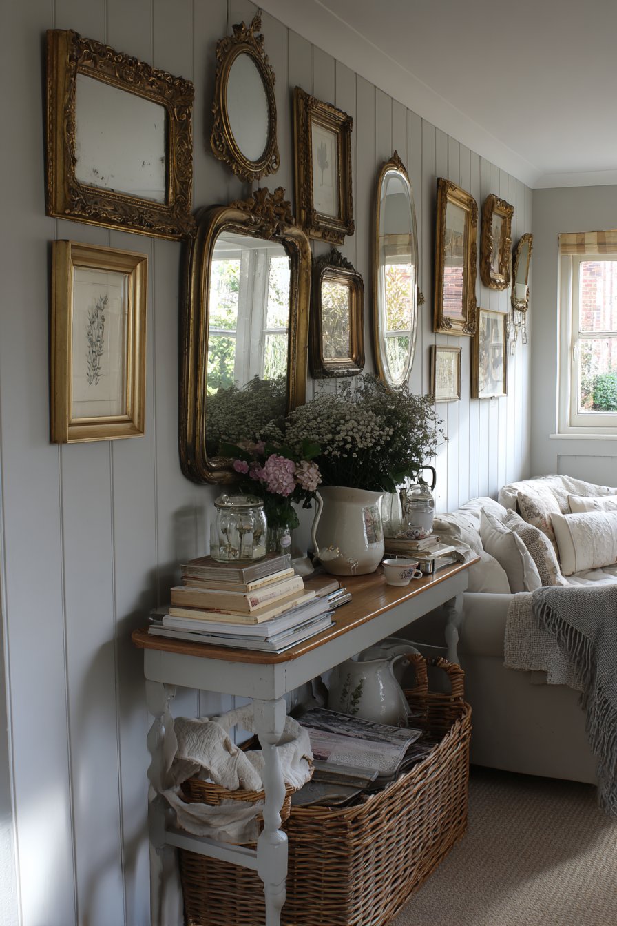 The cottage aesthetic celebrates collected treasures over coordinated sets. Mismatched vintage furniture, varied plate collections, and assorted mirror frames create personality impossible with retail purchasing. This approach proves both economical and environmentally responsible. Quality vintage pieces outlast modern alternatives while offering unique character. The designs demonstrate how sustainable choices create beautiful, lasting cottage spaces.