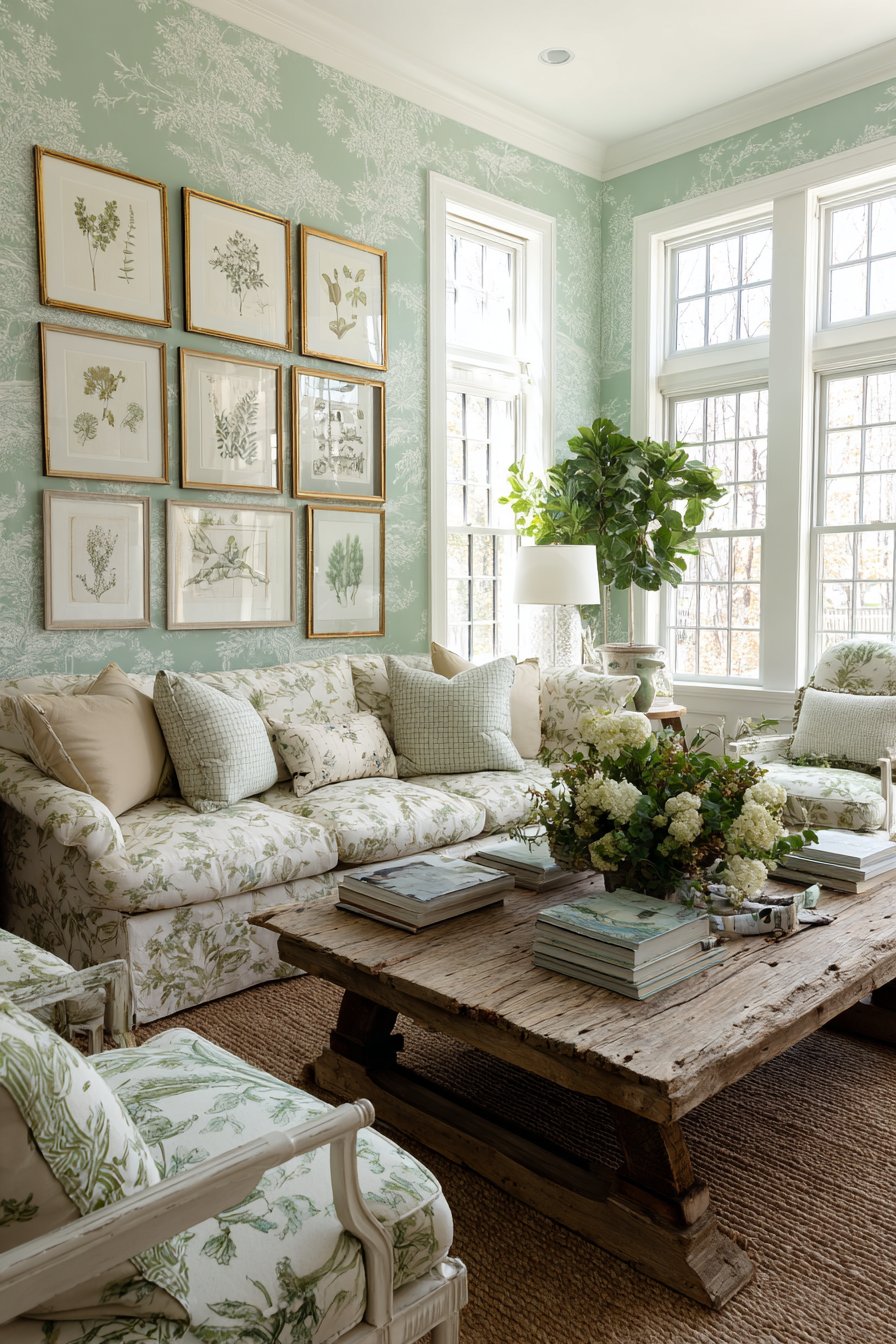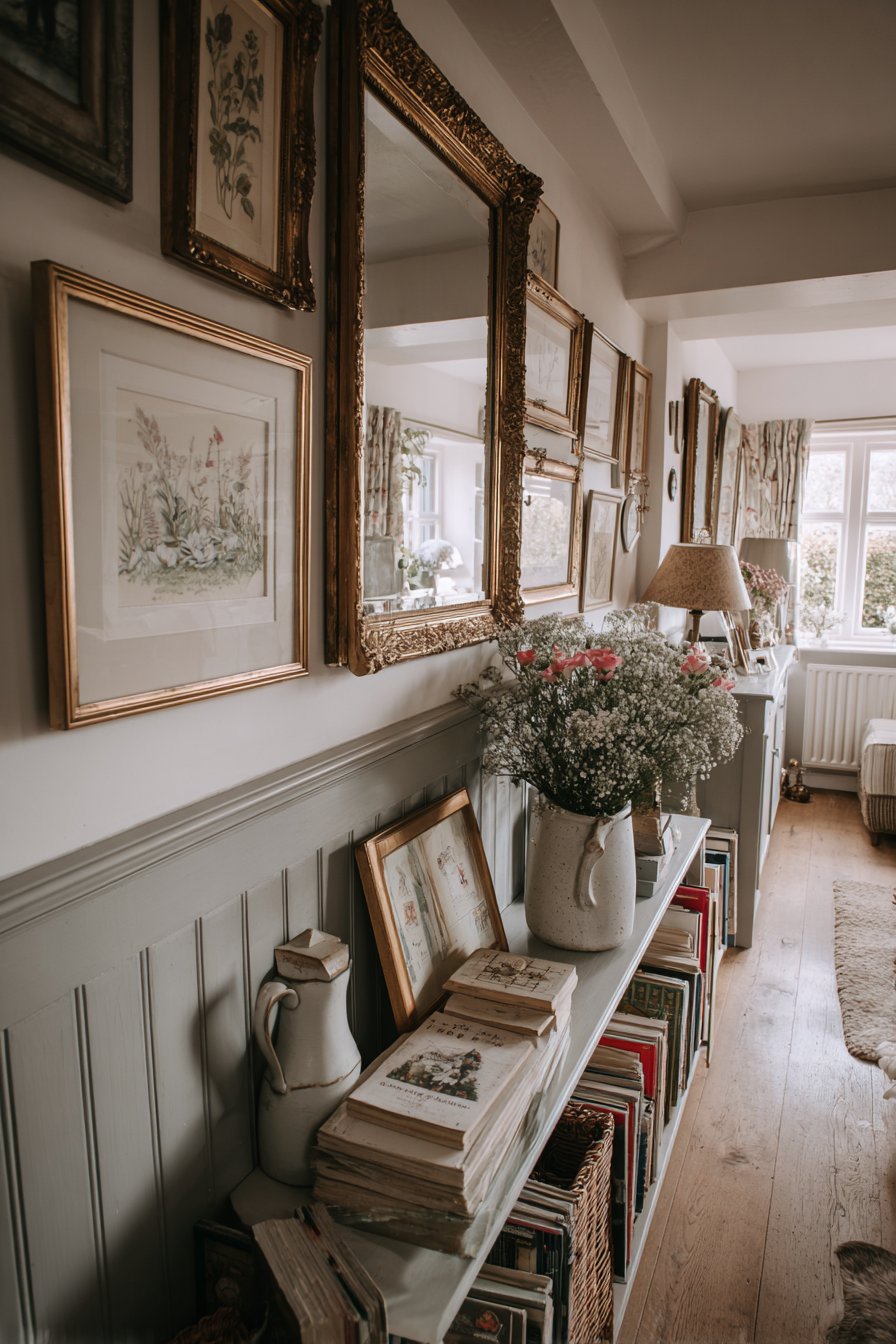 - Add gilt-framed botanical prints for collected cottage gallery walls