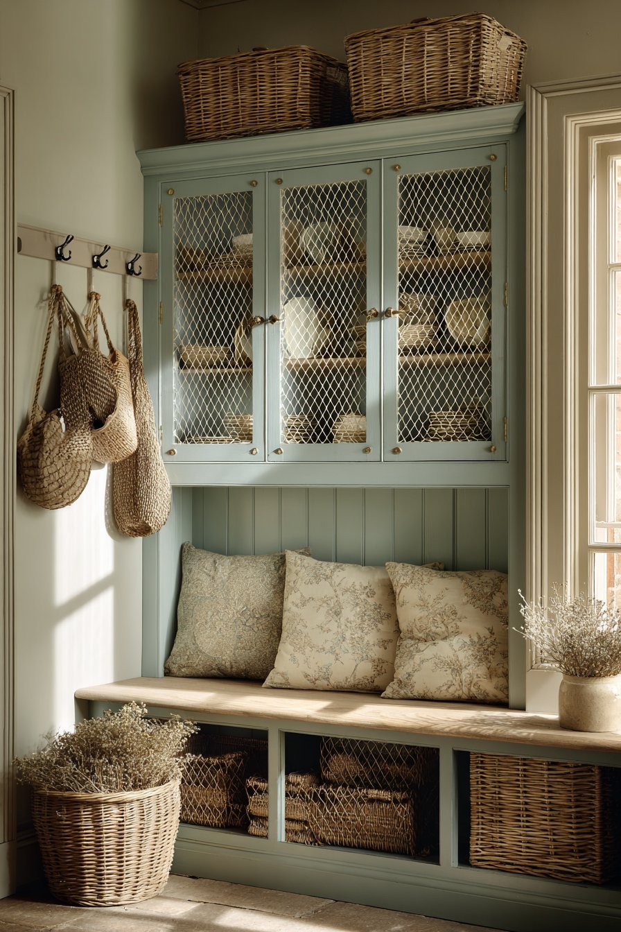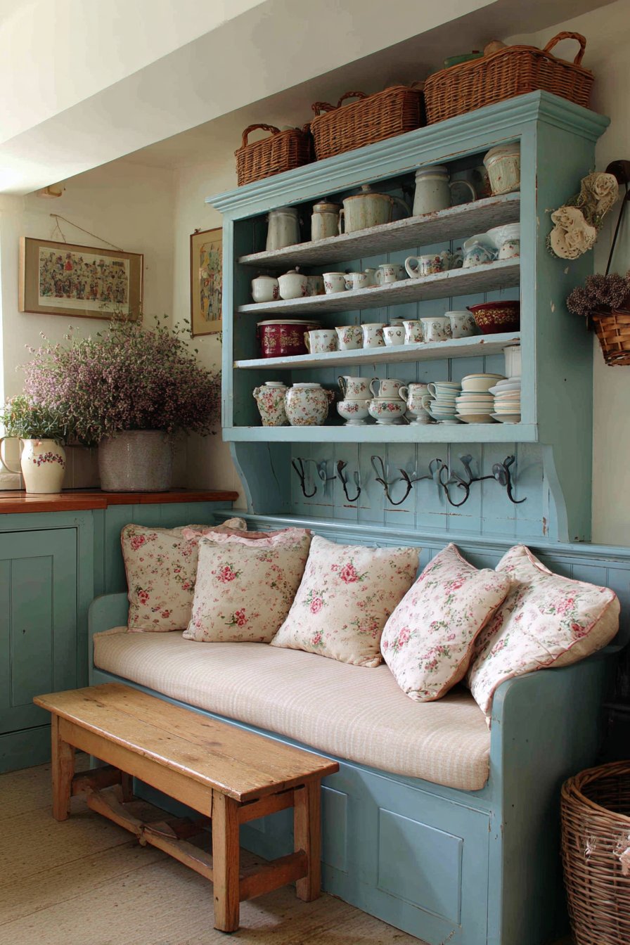 A built-in cupboard painted in heritage blue displays contents through chicken-wire fronted doors. This traditional cottage detail adds charm while keeping stored items visible. Open shelving above holds vintage crockery and woven baskets for organizing cottage essentials. A farmhouse-style pine bench with lift-up seat storage sits below. Faded floral cushions top the bench, providing comfortable seating.