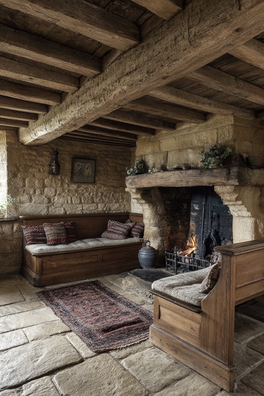 Traditional inglenook arrangement features flagstone floor area defining the hearth zone. This contrasts beautifully with surrounding wide-plank wooden flooring. Two sturdy oak settle benches with high backs flank the central stone fireplace. Storage compartments beneath the benches provide practical organization. Hand-forged iron accessories add authentic period detail.