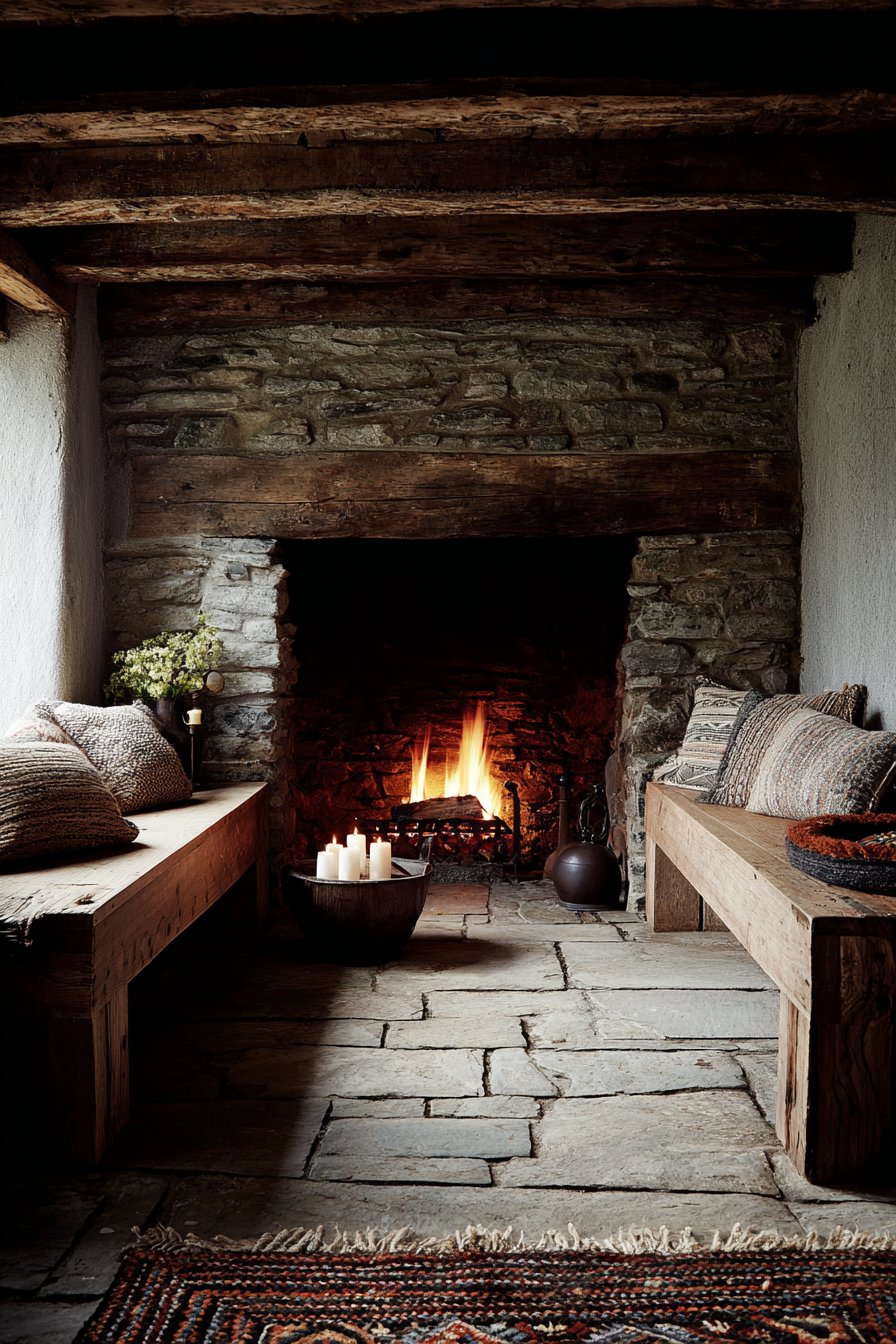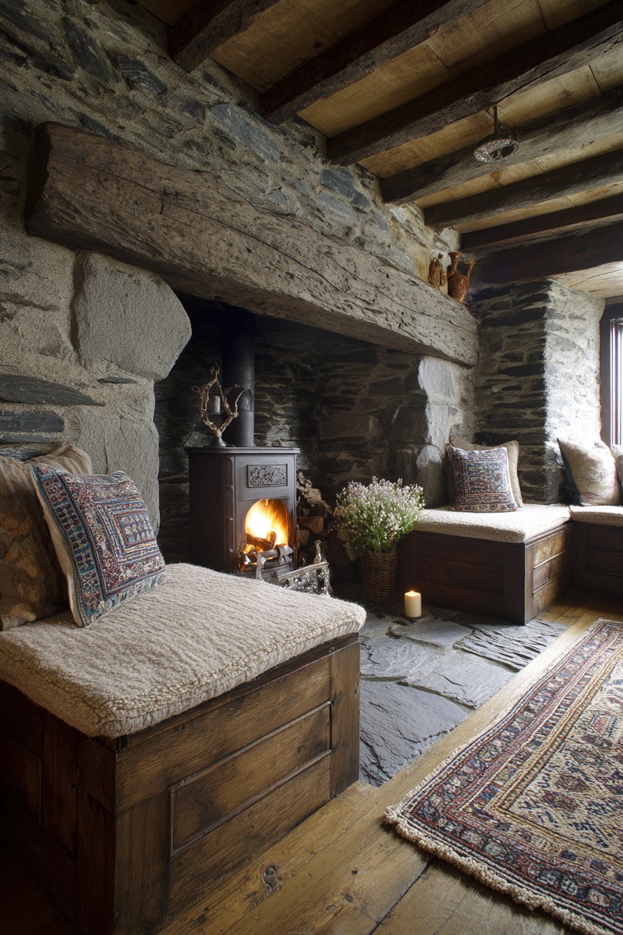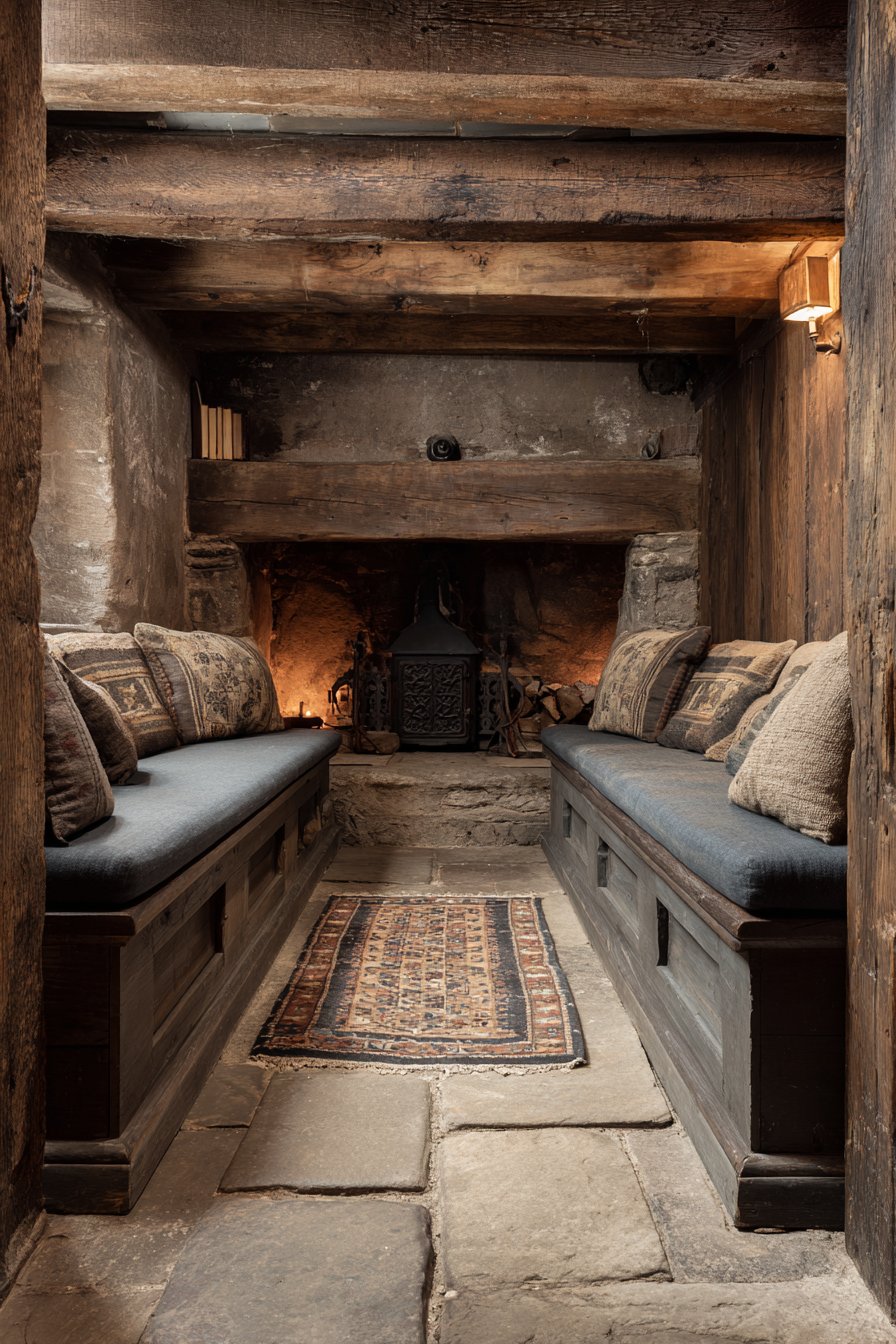 Vintage kilim cushions add color to the dark oak seating. A small antique Persian runner protects the stone floor while adding pattern. Low ceiling beams frame the intimate hearth space. The material contrasts create cottage richness. Smooth stone, aged wood, and woven textiles each contribute distinct textures.