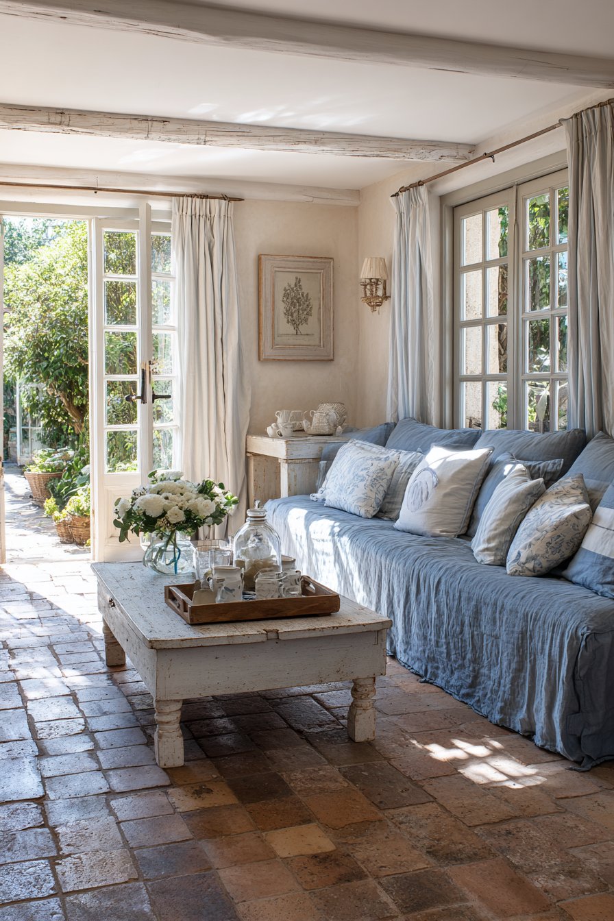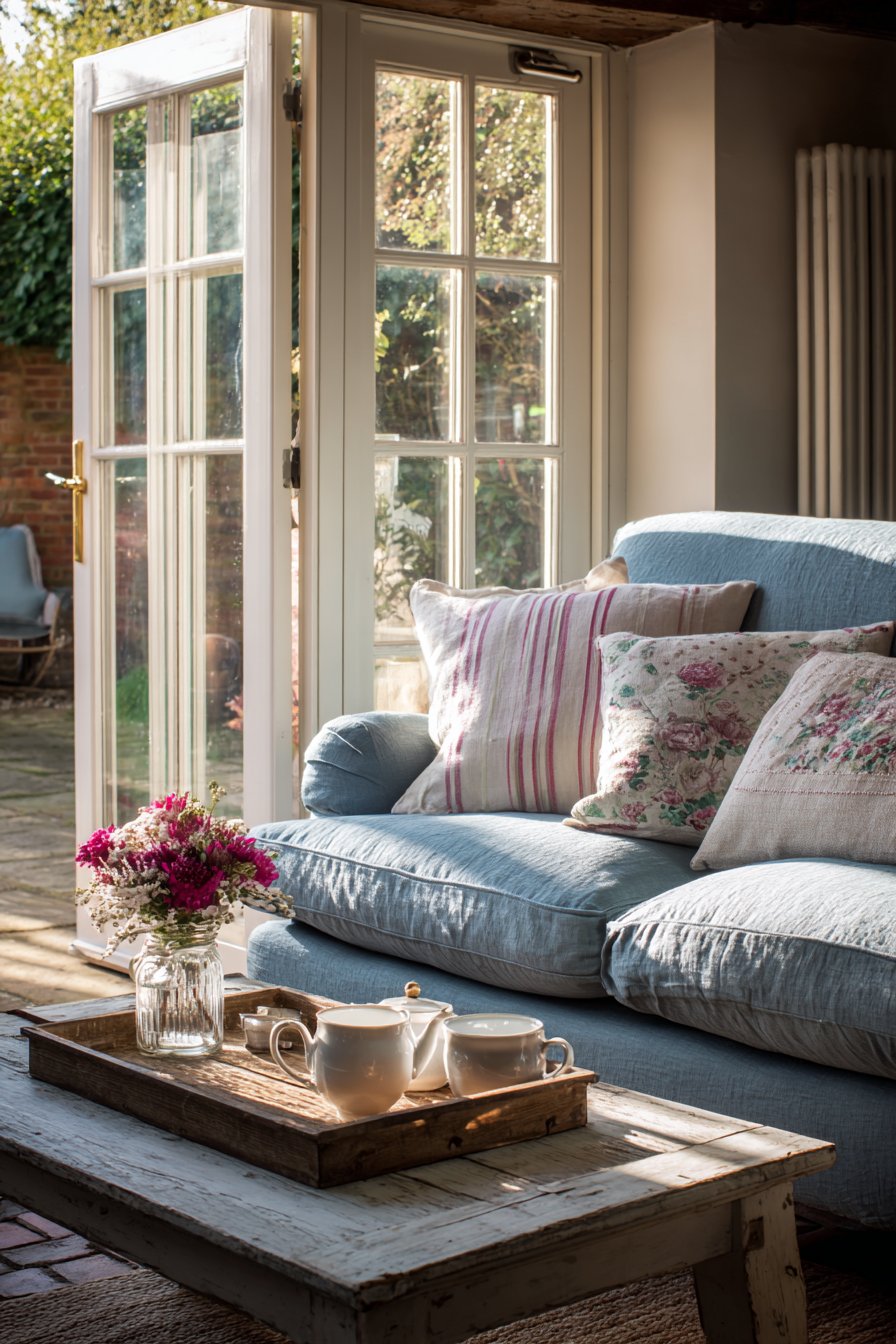 French doors leading to the cottage garden create strong indoor-outdoor connection. The deep-cushioned sofa in faded denim blue linen positions to face these doors. The seating arrangement invites garden contemplation while providing comfortable lounging. Cushions layer across the sofa in vintage florals, grain sack stripes, and hand-embroidered linens. A distressed painted coffee table holds a wooden tray with tea service.