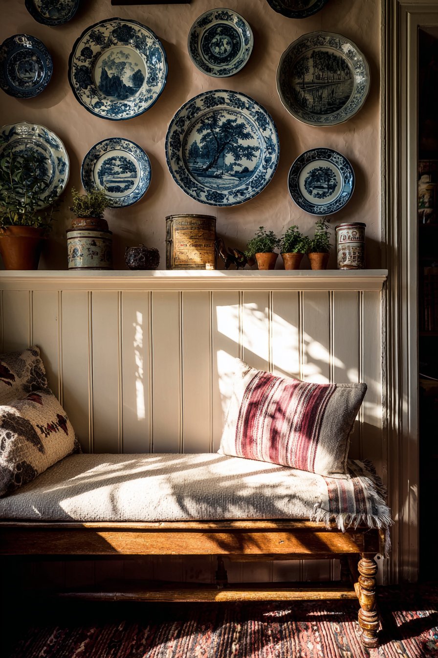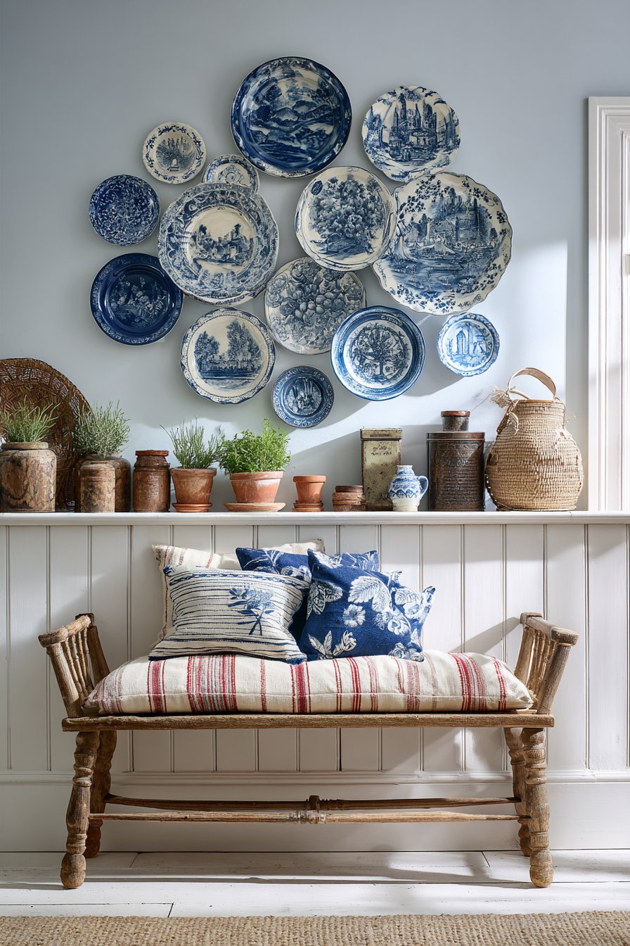 A collection of vintage plates in blue and white patterns creates striking wall art above a narrow shelf. Willow, florals, and transferware patterns mix in organic cluster arrangement. The shelf below displays small potted herbs in terracotta pots. Vintage tins add collected character and practical storage. Below, a pine bench with turned legs provides seating.
