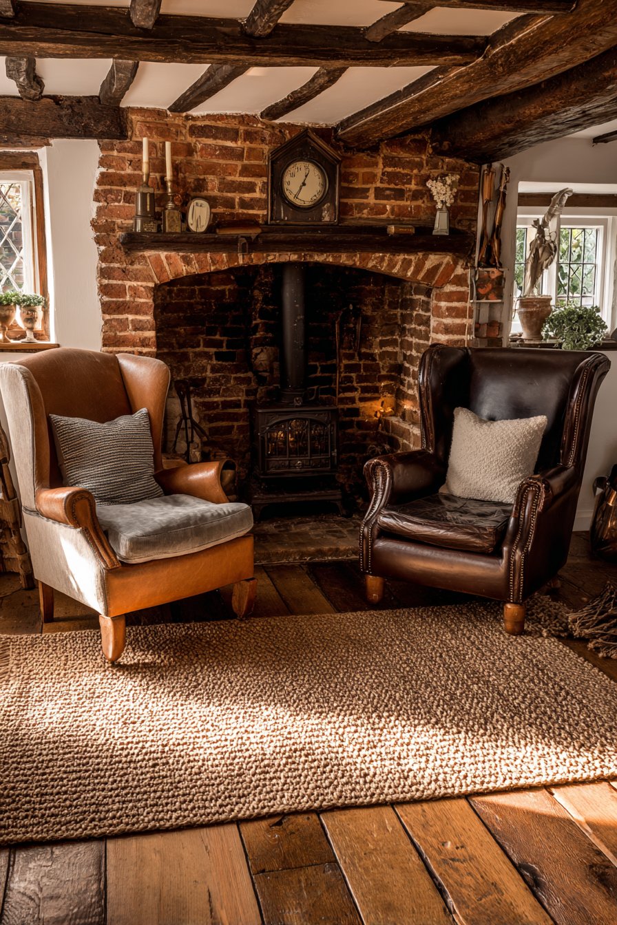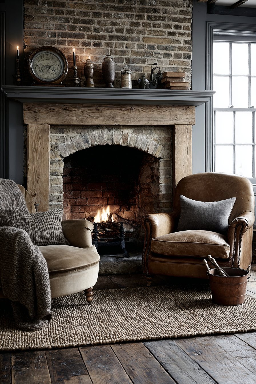 The traditional brick fireplace features a basket arch opening and simple oak mantel. A vintage clock centers the mantel display with candlesticks showing dripped wax. The hearth flanks with two mismatched vintage armchairs. One chair features faded velvet upholstery while the other shows worn leather. Hand-knit throws drape over both chairs, adding texture and warmth.