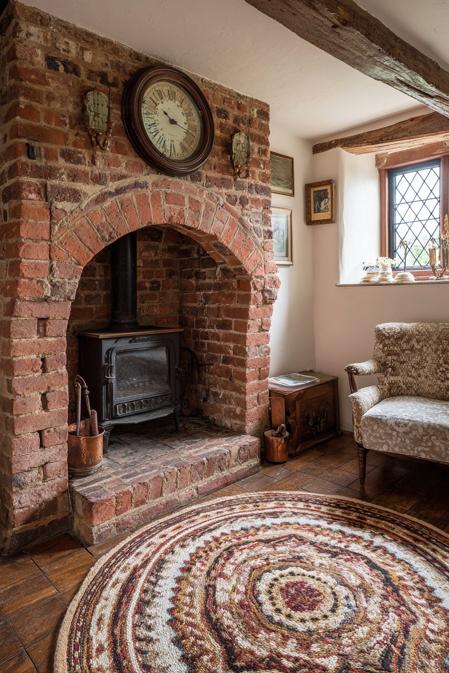 Basket arch brick fireplaces represent traditional cottage masonry construction. The curved arch distributes weight while creating visual softness. Simple oak mantels suit cottage scale better than elaborate surrounds. The horizontal grain patterns add natural beauty.