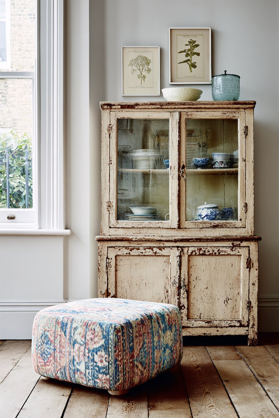 A small footstool upholstered in vintage kilim provides flexible seating. Natural pine floorboards with hand-scraped finish extend throughout the space. Natural light from a nearby window illuminates the cupboard contents. The paint layering and wood grain create beautiful aging patterns. Worn edges reveal earlier paint colors beneath current surfaces.