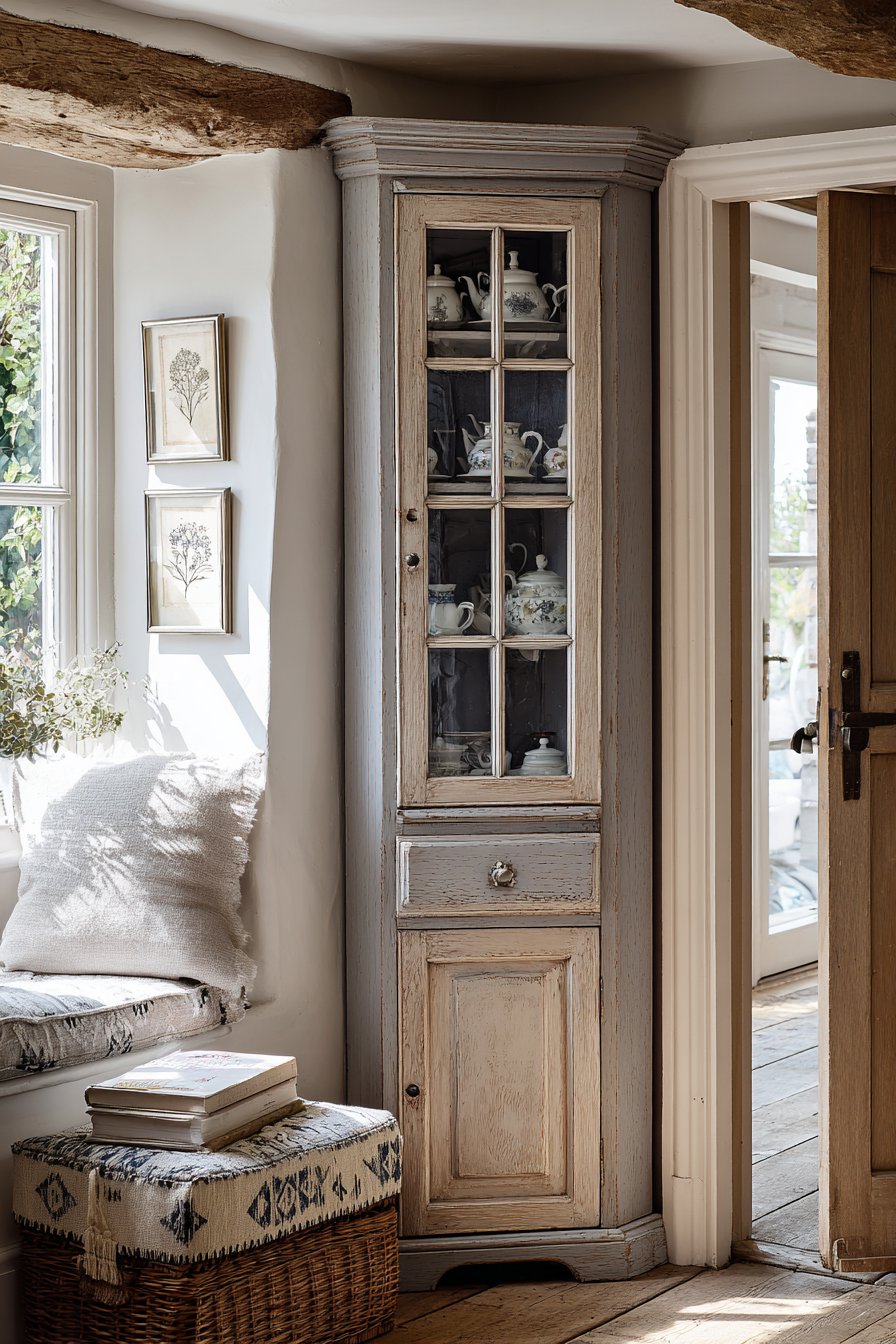 Corner cupboards maximize cottage storage without consuming wall space needed for windows or doors. The tall vertical format suits cottage proportions perfectly. Glass-paned doors protect collections while allowing display. Lower solid doors hide less attractive storage items.