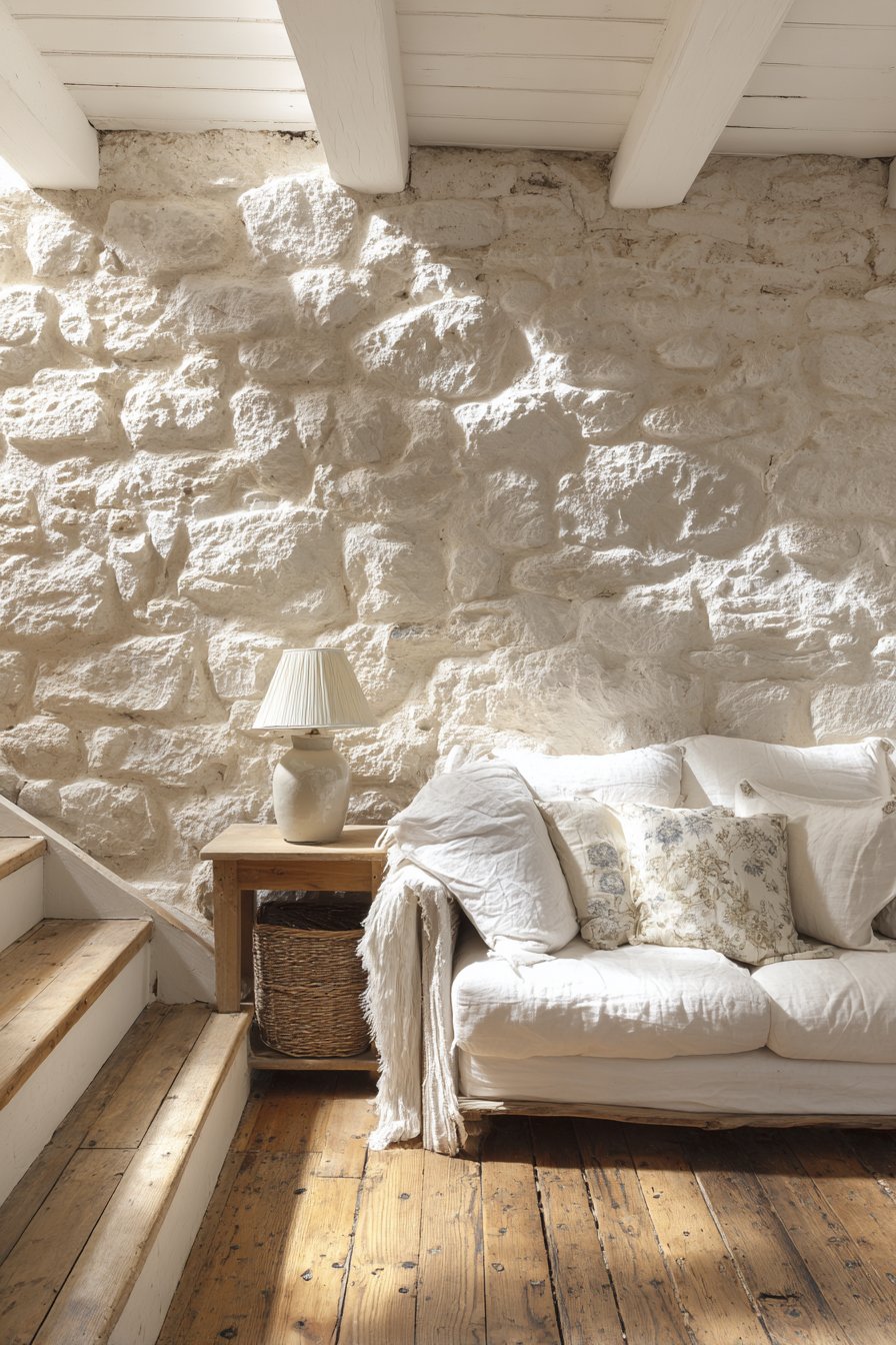 - Apply limewash to exposed stone walls for traditional breathable finish