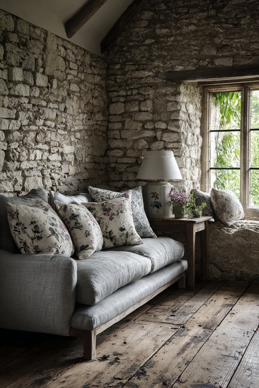 Exposed stone walls with limewash finish reveal texture and irregularities in the stonework. The soft white finish brightens while preserving authentic cottage architecture. A compact wood-frame sofa with loose linen covers sits against the stone. Cushions pile high in vintage ticking, faded florals, and hand-woven textiles. A simple oak side table holds a vintage ceramic lamp with fabric shade.