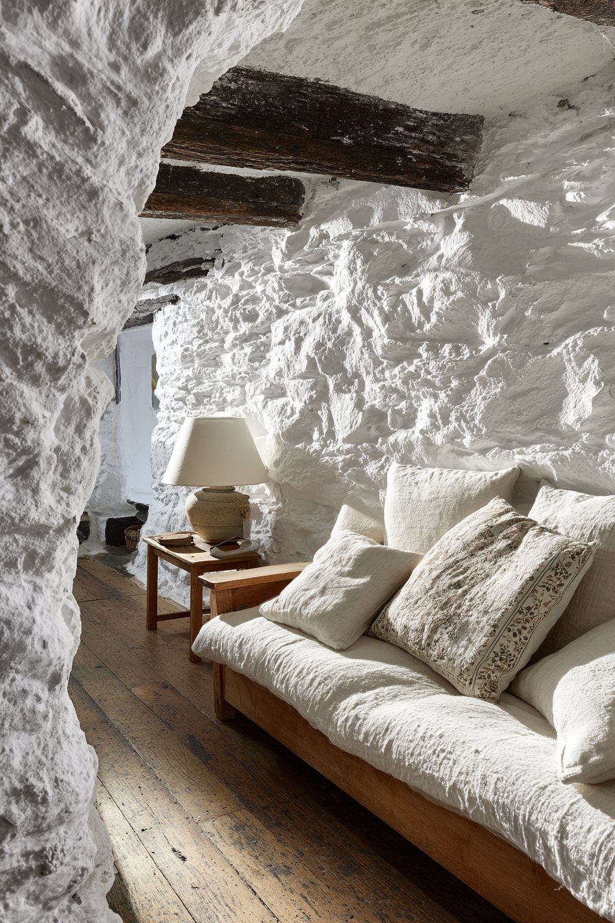 Limewash represents traditional cottage wall finish that allows stone to breathe while providing protection. The matte finish creates soft backgrounds that enhance rather than compete with furnishings. Exposed stone walls demonstrate honest construction methods using local materials.