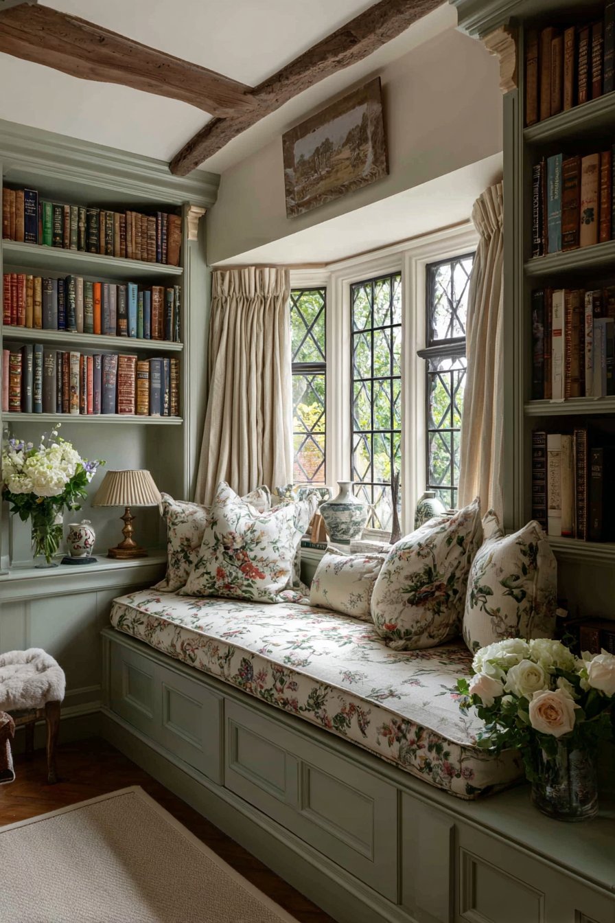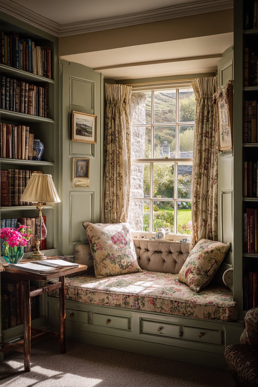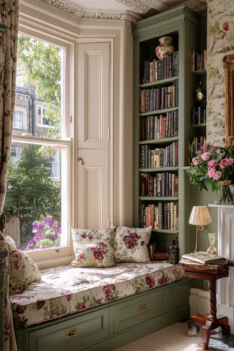The traditional bay window features a restored original wooden window seat with button-tufted cushioning. Vintage floral fabric adds pattern and cottage softness. Built-in bookcases line the bay walls, painted in soft sage green. Vintage hardback books fill the shelves alongside pottery and framed family photographs. A small drop-leaf table serves as reading spot with vintage brass lamp providing task lighting.