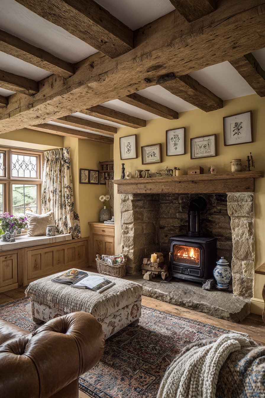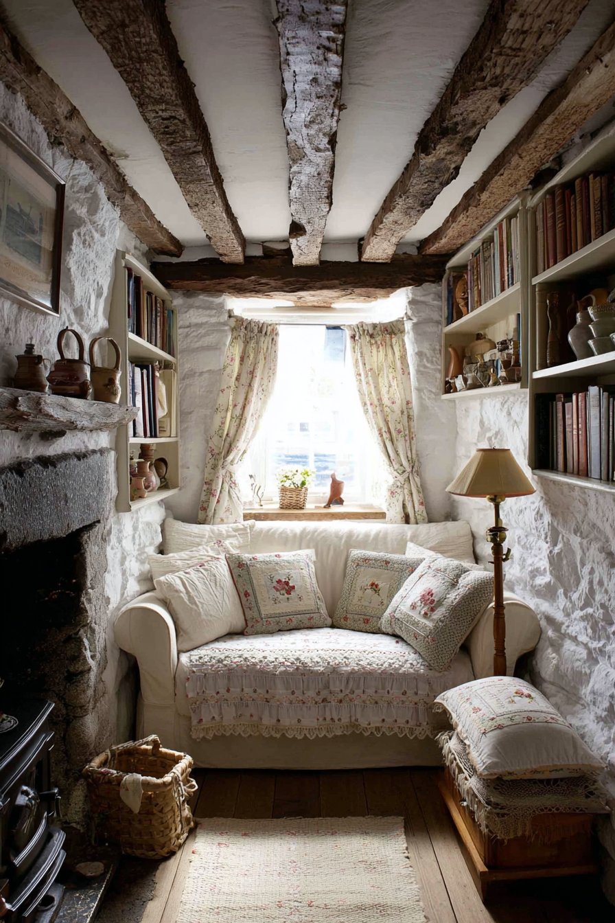 - Install built-in bookshelves flanking the fireplace for cottage storage character